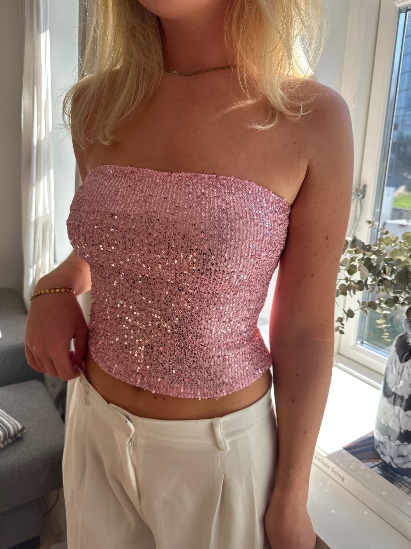 Fuldend dit nytårslook med denne fantastiske pink glitter top, der er dækket af masser af glitrende palietter! Den fanger lyset og får dig til at stråle, uanset hvor du går. Perfekt til at danse hele natten – eller bare få opmærksomhed på den bedste måde!