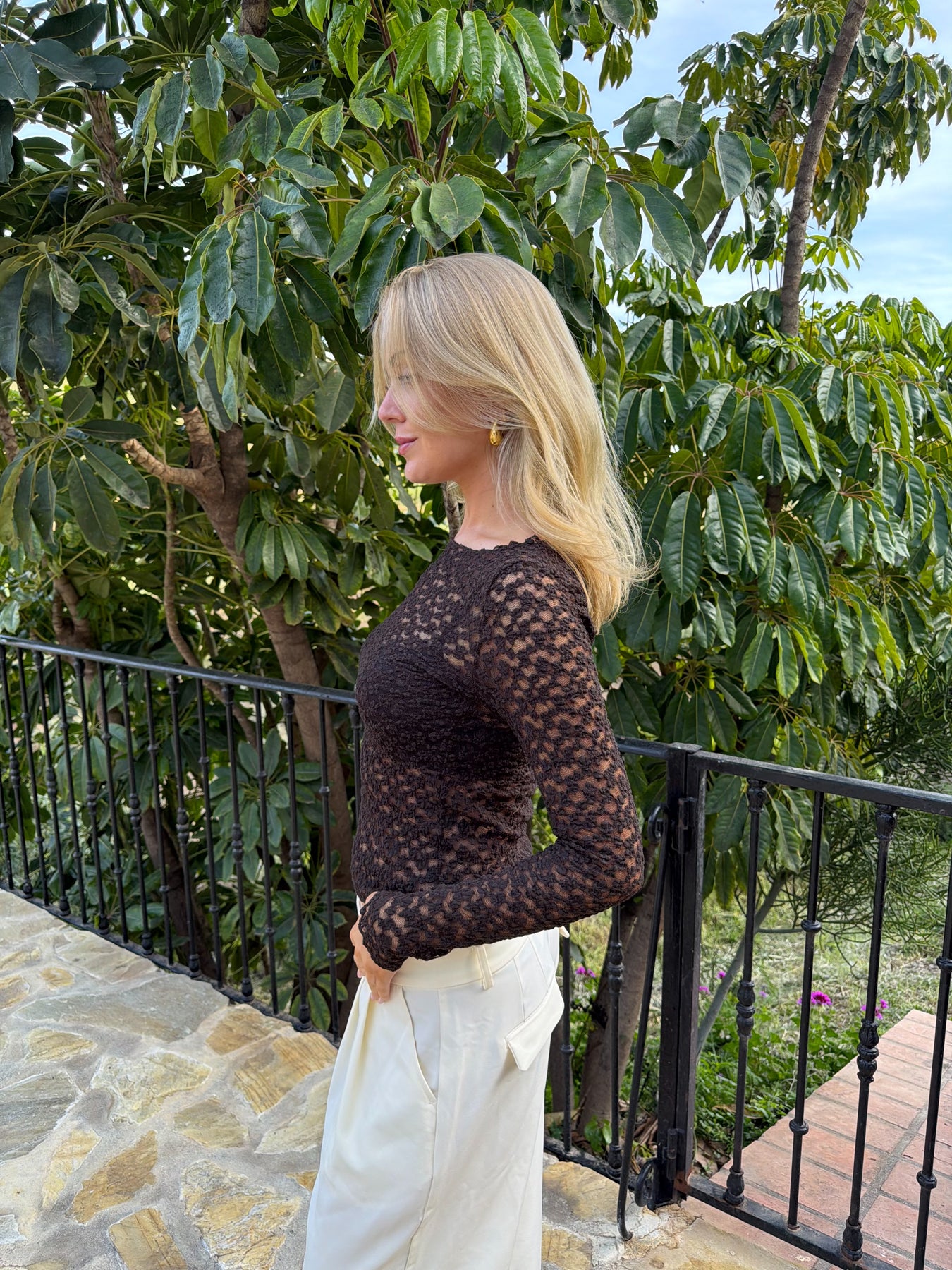 En elegant og tidløs blonde top, der kombinerer det klassiske med det moderne. Toppen er fremstillet i et let gennemsigtigt blondemateriale med et smukt mønster, der giver et feminint og eksklusivt udtryk. Den tætsiddende pasform og lange ærmer gør den både sofistikeret og alsidig – perfekt til både hverdag og fest.