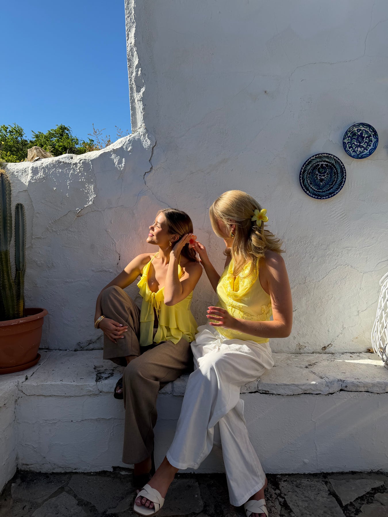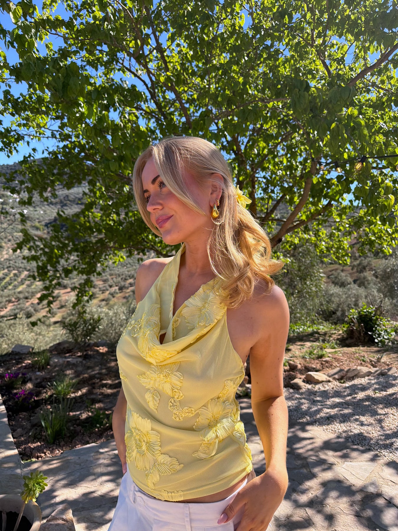 De detaljerede blomsterbroderier tilføjer et eksklusivt touch og gør toppen til et perfekt valg både til hverdag og fest. Det åbne rygdesign giver et moderne udtryk.