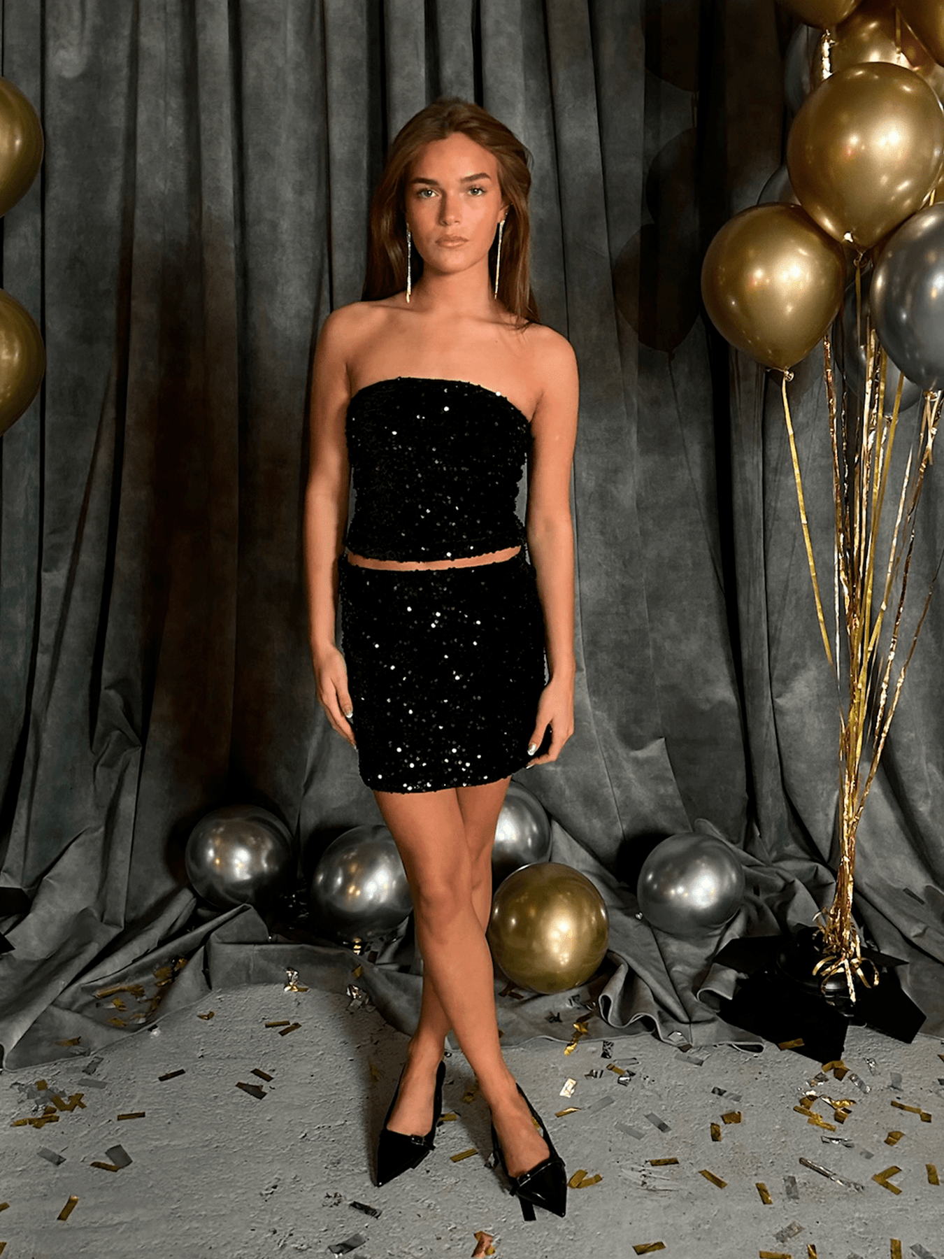 Uanset om du kombinerer den med en glitrende nederdel eller holder det mere minimalistisk, er denne sorte velvet top med glimmer et must-have til årets festligste begivenheder.