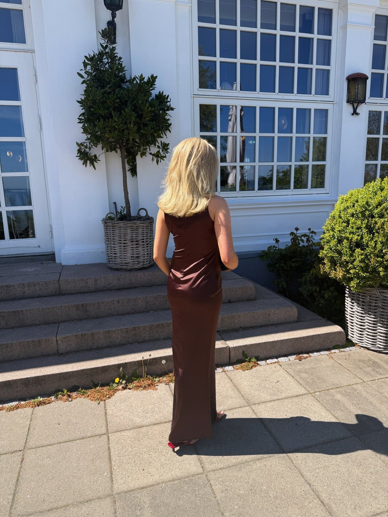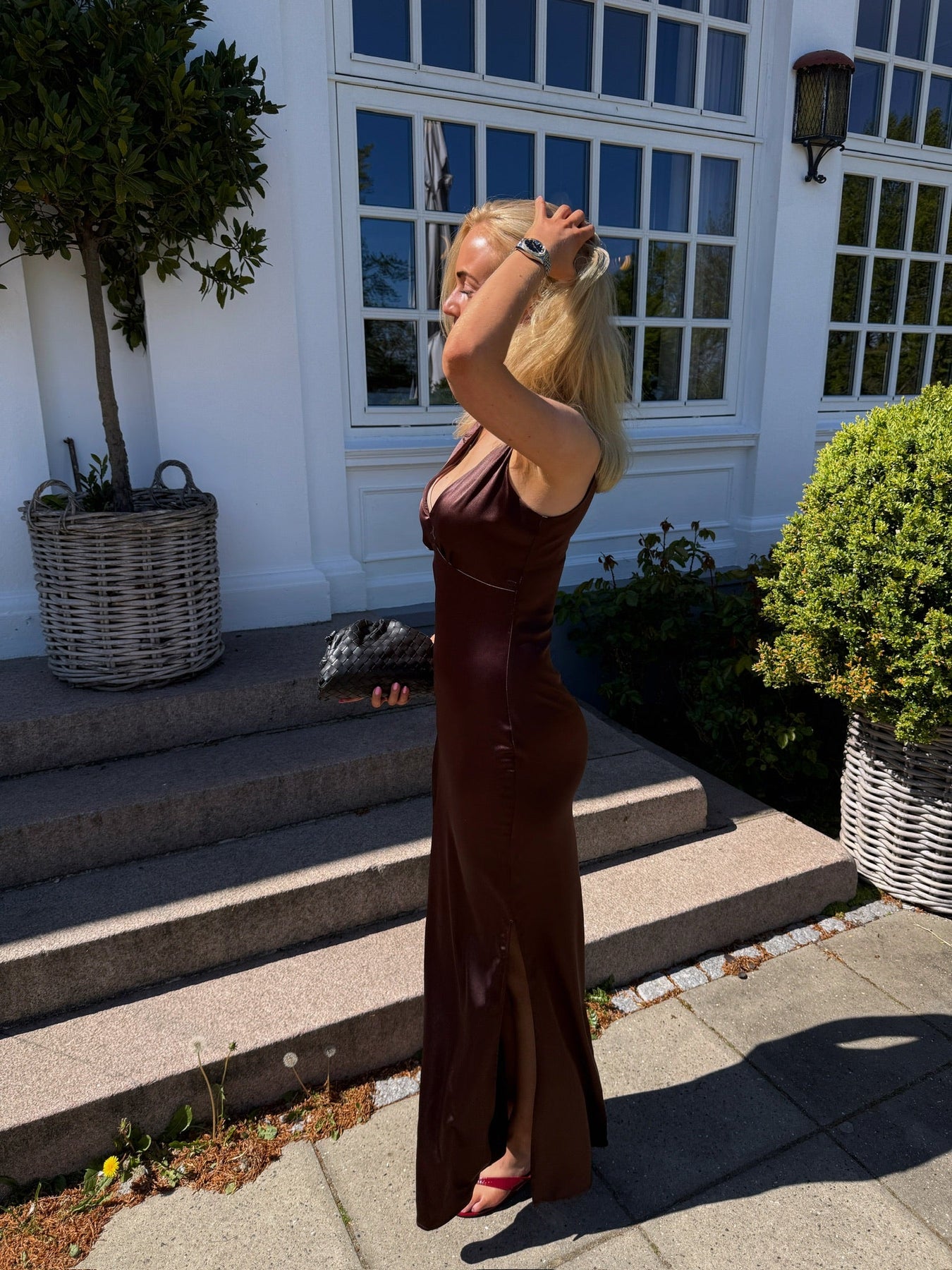 Den smukke, mørkebrune farve giver et eksklusivt vibe, mens den bløde, skinnende kvalitet får kjolen til at falde elegant omkring kroppen. Den har en flatterende V-udskæring og en let slids i siden, som gør den både feminin og nem at bevæge sig i.
