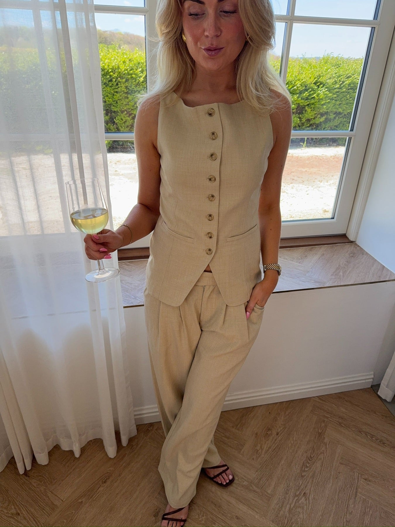 Dette lækre sæt består af habitbukser i en lidt oversize stil, der giver et moderne og afslappet look, samtidig med at de bevarer den klassiske elegance. Bukserne er perfekte til både hverdag og fest, og den lette pasform gør dem super komfortable. Den elegante vest, med knapper ned langs foran, tilføjer et sofistikeret touch til sættet og skaber et skarpt, men stilfuldt udtryk. Dette sæt er ideelt til dig, der vil have noget tidløst og samtidig trendy – det kan nemt styles til både formelle og afslappede anledninger.