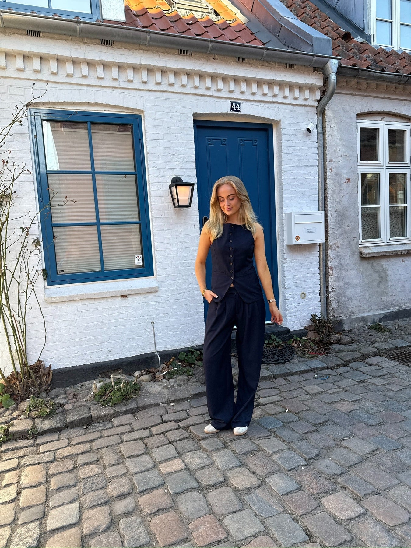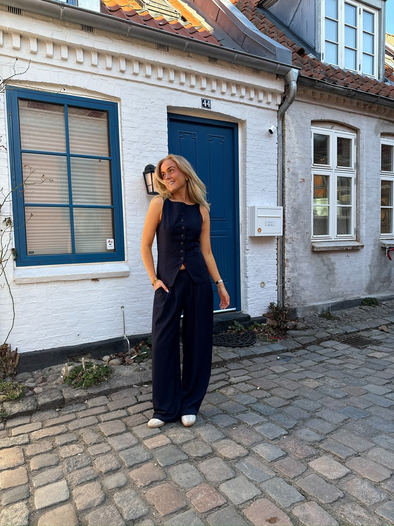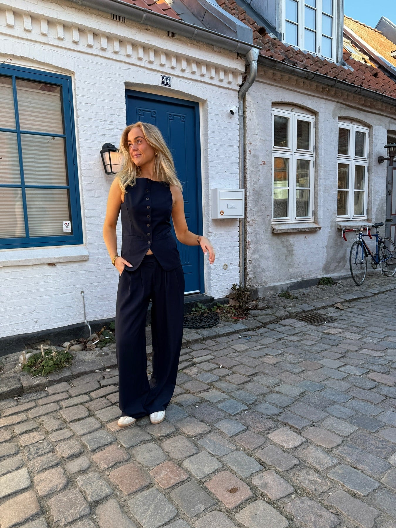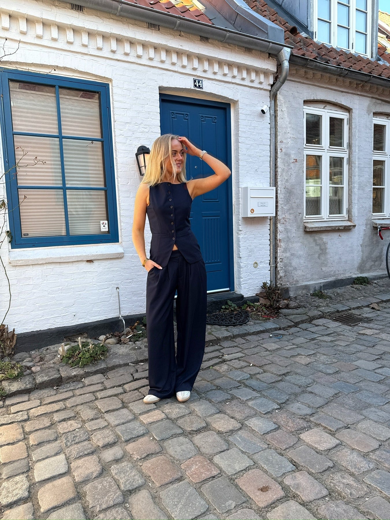 Dette lækre sæt består af habitbukser i en lidt oversize stil, der giver et moderne og afslappet look, samtidig med at de bevarer den klassiske elegance. Bukserne er perfekte til både hverdag og fest, og den lette pasform gør dem super komfortable. Den elegante vest, med knapper ned langs foran, tilføjer et sofistikeret touch til sættet og skaber et skarpt, men stilfuldt udtryk. Dette sæt er ideelt til dig, der vil have noget tidløst og samtidig trendy – det kan nemt styles til både formelle og afslappede anledninger.