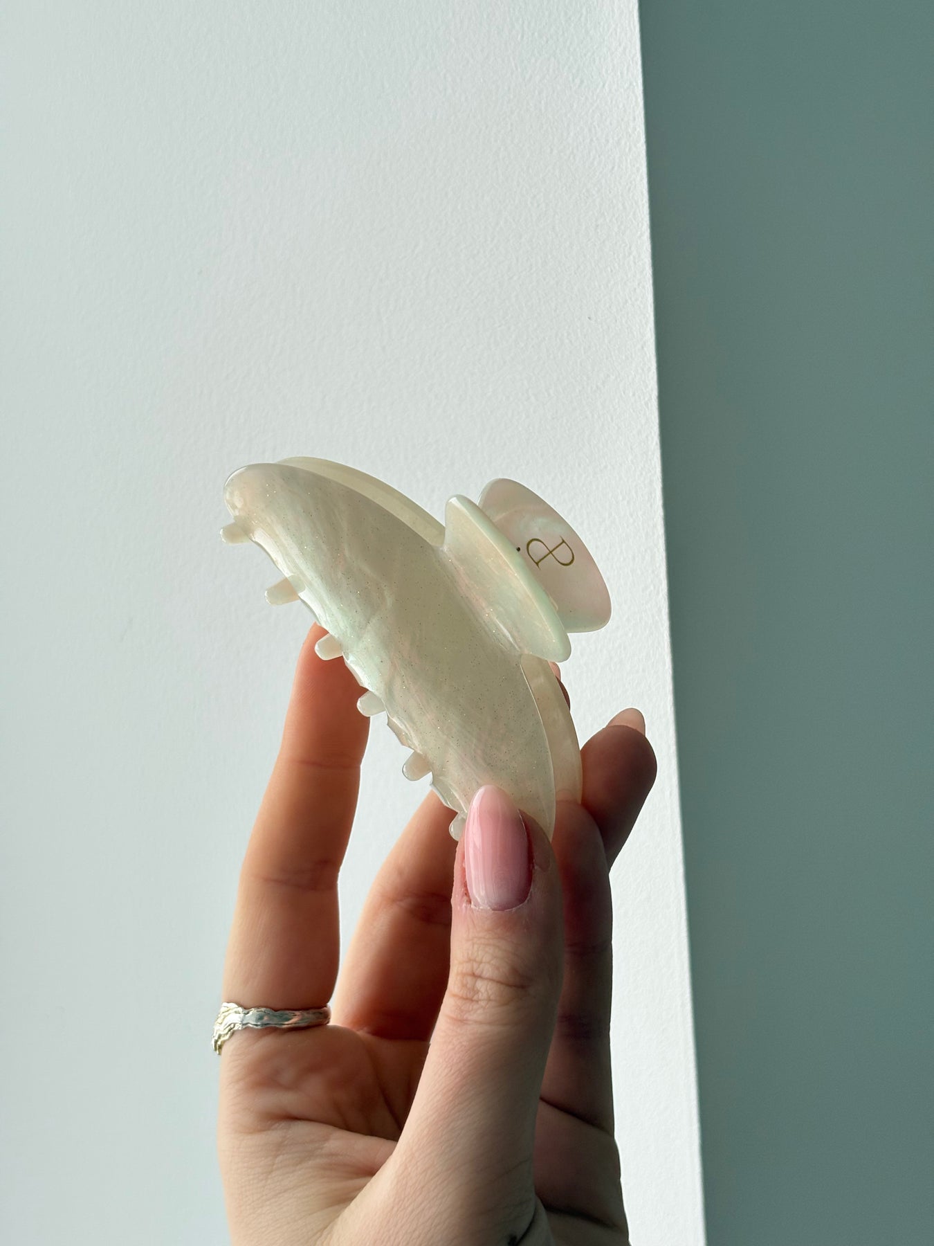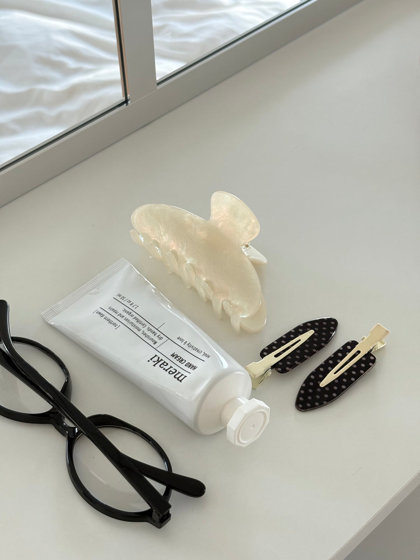 En stilren hårklemme med et subtilt, perlemorsagtigt skær og elegant logo-detalje. Det klassiske design kombineret med en glansfuld overflade gør den ideel til både hverdag og mere festlige anledninger.