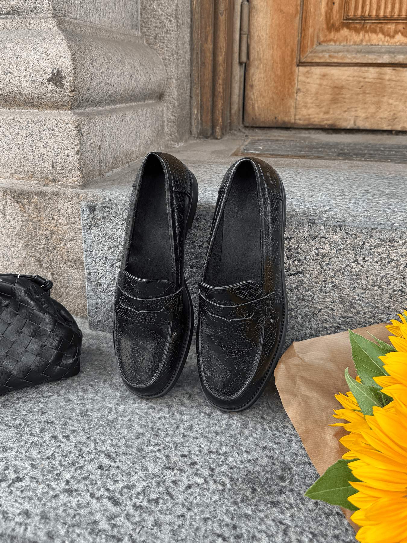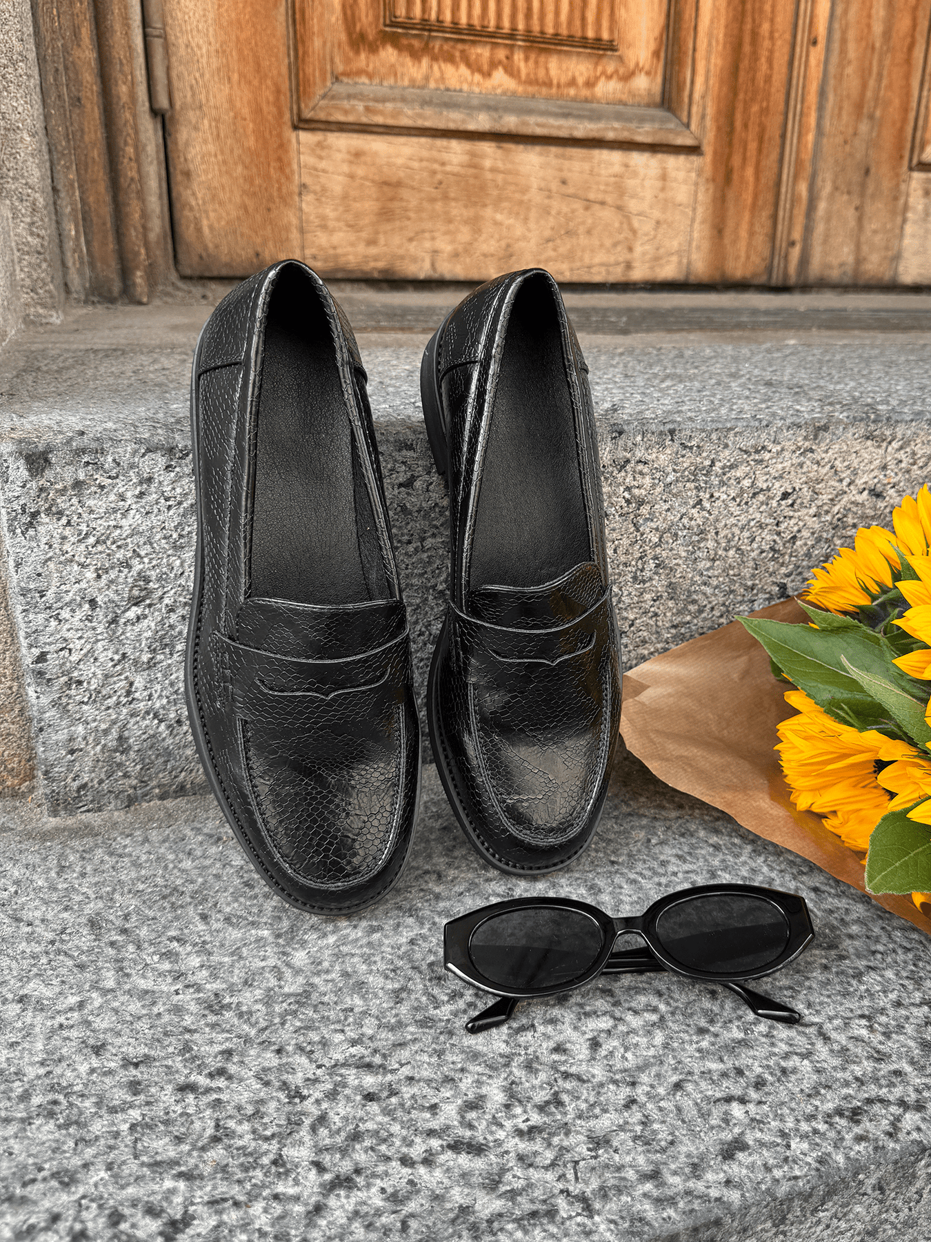 Ellie Loafers er en klassisk sort loafer med krokodille lignende overflade og en tidløs silhuet. Den har en flad, solid sål og et enkelt design, der gør den nem at bruge til både arbejde og hverdag.
