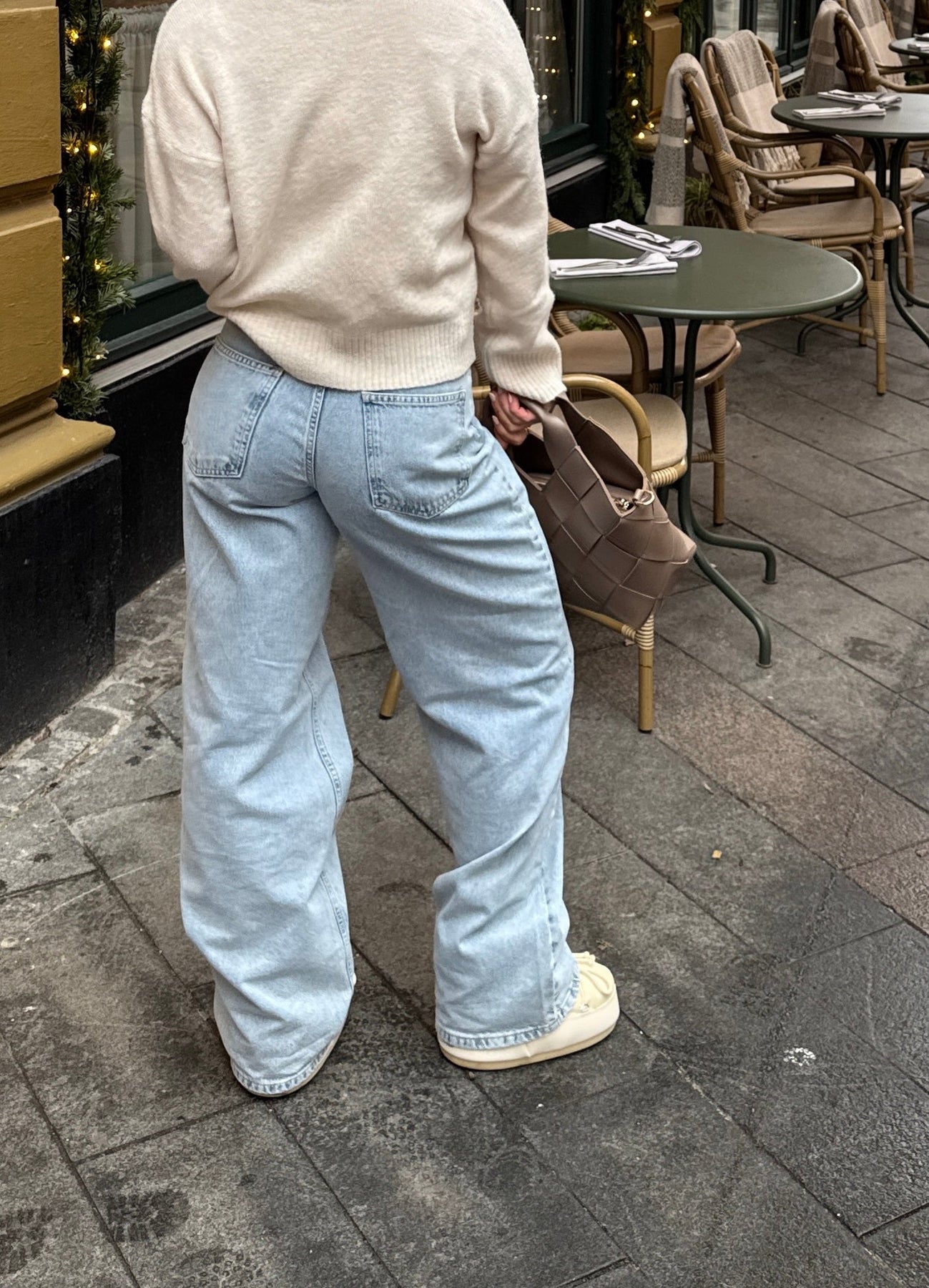 Disse lyseblå jeans er et must-have i enhver garderobe. Med deres afslappede, løstsiddende pasform og klassiske denimvask kombinerer de cool streetwear vibes med tidløs stil. Den høje talje og de brede ben skaber et flatterende og moderne snit, der passer perfekt til både hverdag og mere dressed-up looks. Style dem med en simpel tanktop og cardigan for et casual, effortless outfit.