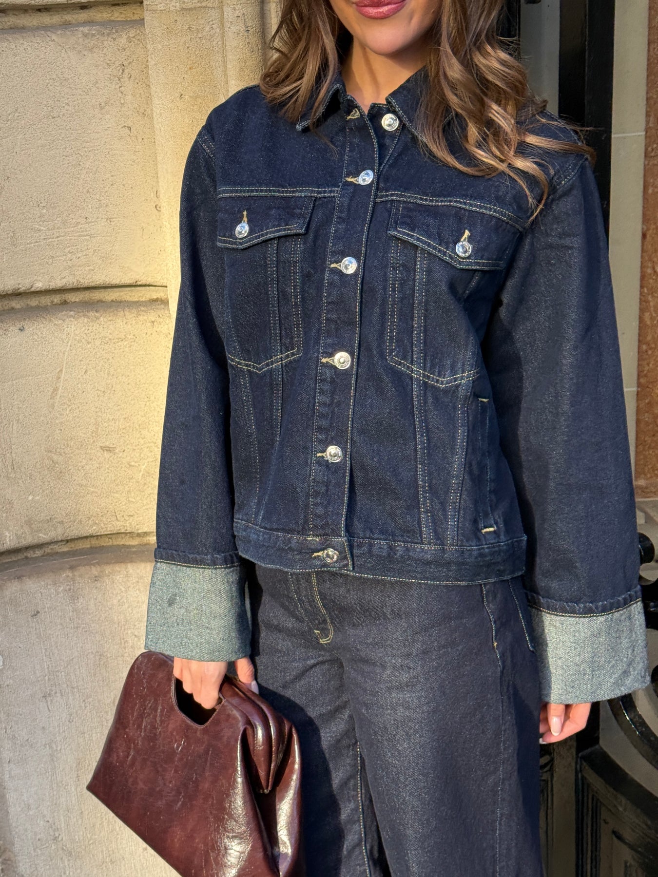 En klassisk denimjakke med et moderne twist! Jakken er skåret i en kraftig rå denim med cool kontrastsyninger og oversized fit. De brede ærmer med ekstra længde og opbuk giver jakken et casual og edgy look, perfekt til både jeans og kjoler.