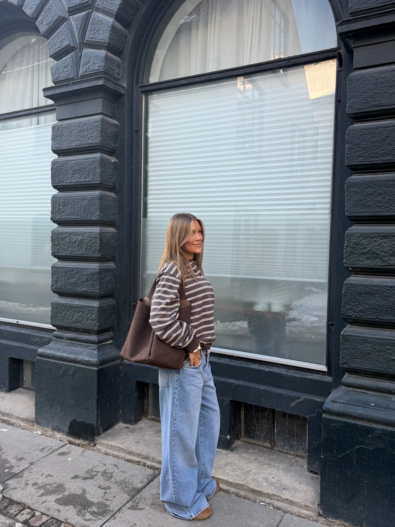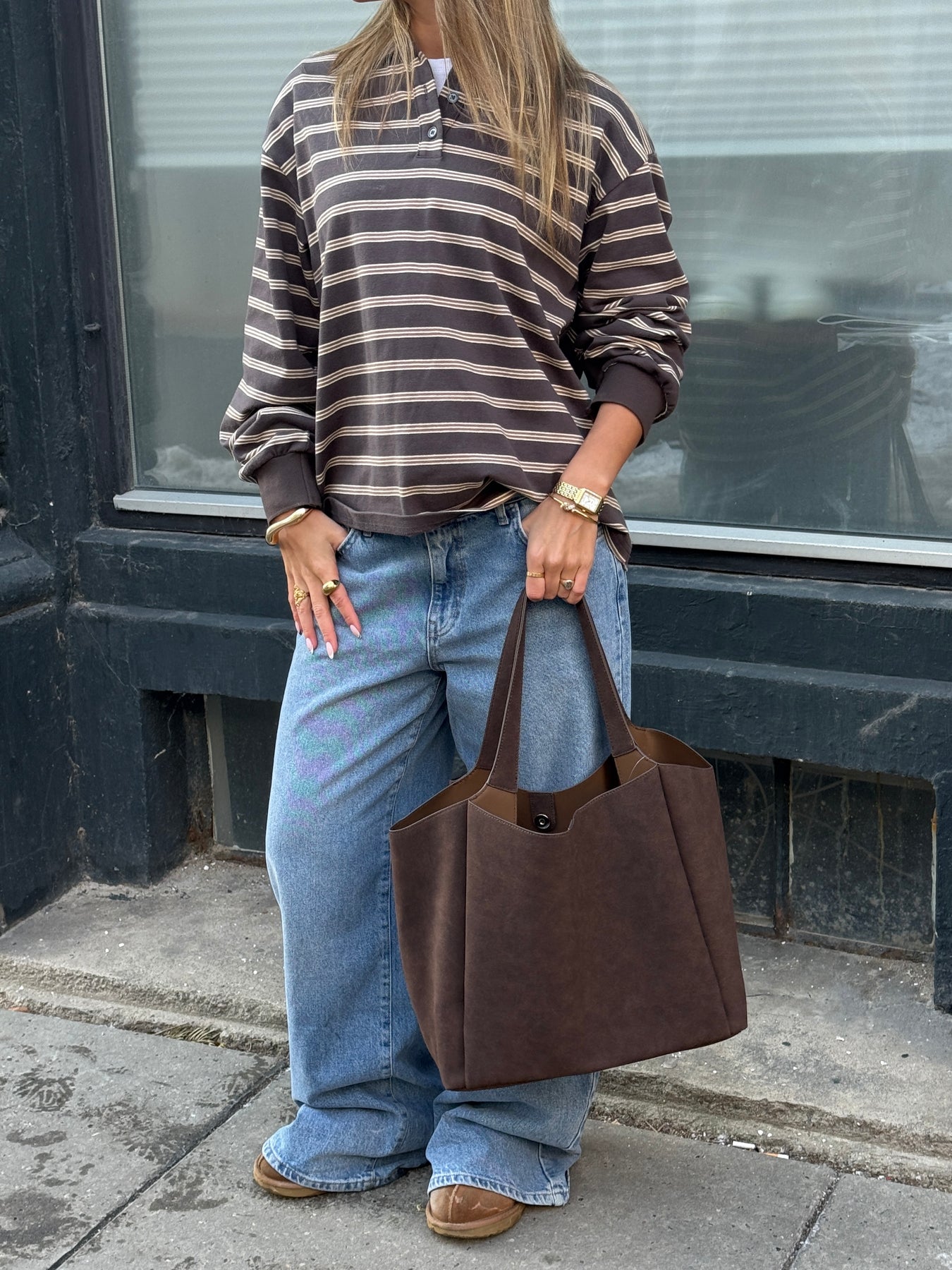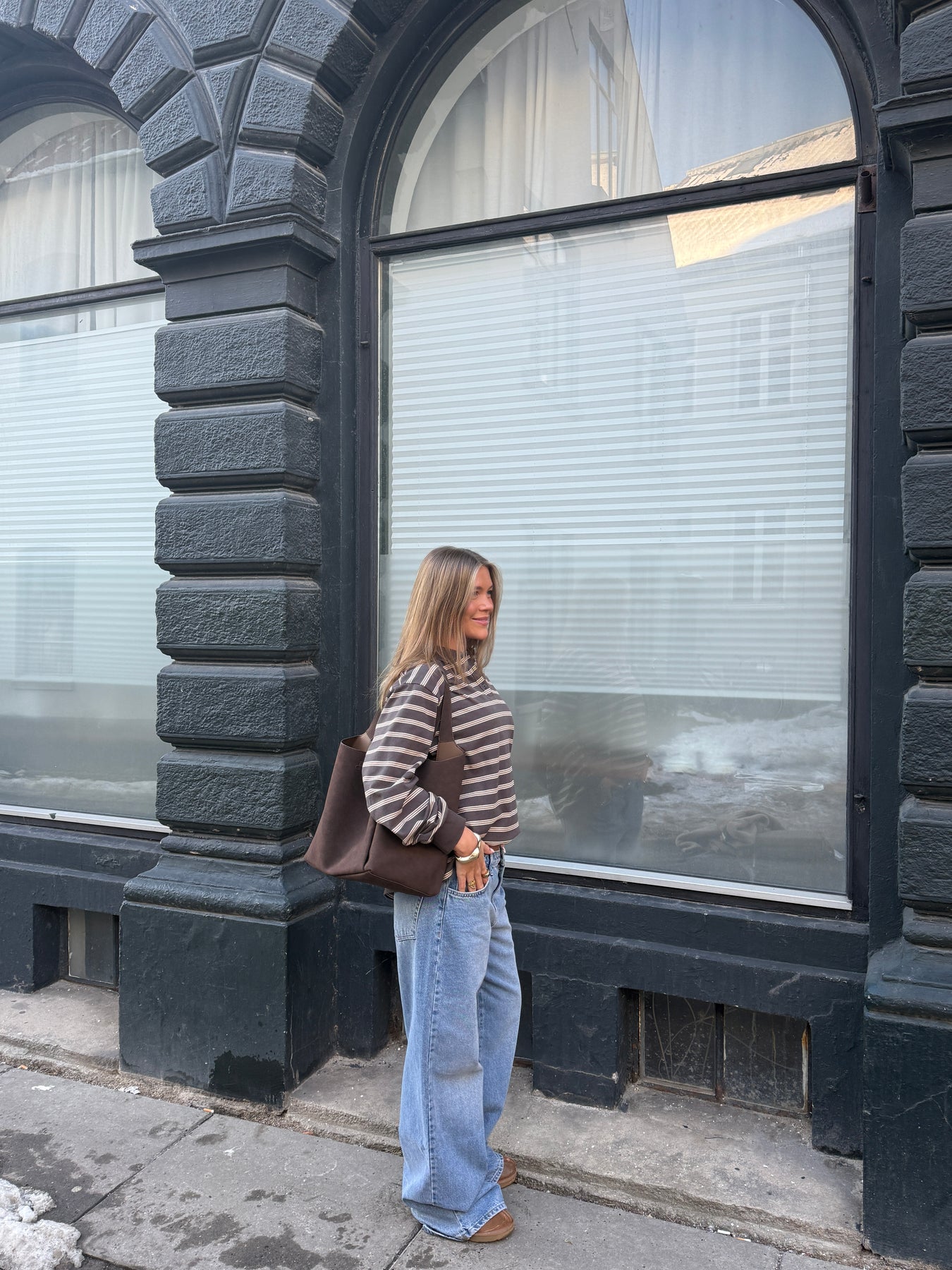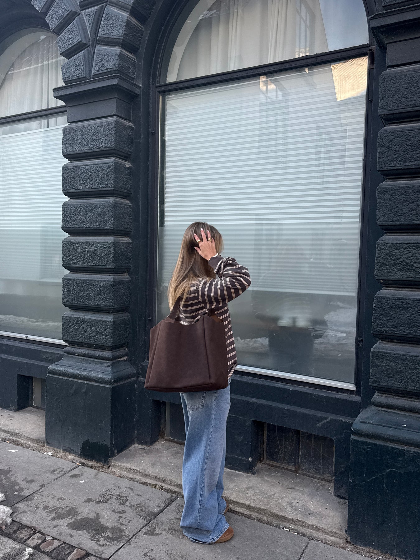 Sophia Bag Medium er en blød og rummelig tote, der kombinerer et minimalistisk design med et elegant faux suede-look. De brede stropper gør den behagelig at bære, og størrelsen er perfekt til både hverdagens essentials og små ekstra ting. En alsidig og stilren taske, der nemt løfter dit outfit.