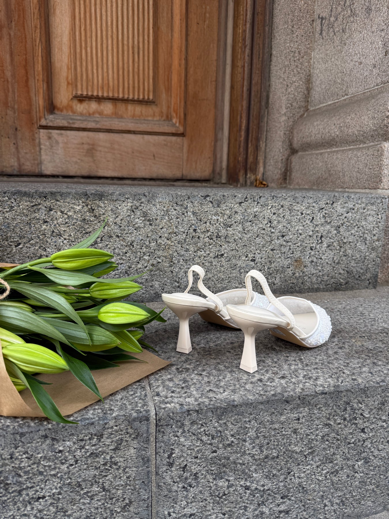 Vores Svea Sequins Slingbacks i Cream White er udført i det smukkeste palliet stof med spids snude. Modellen har en lav, smal hæl og sikrer en behagelig pasform hele aftenen.