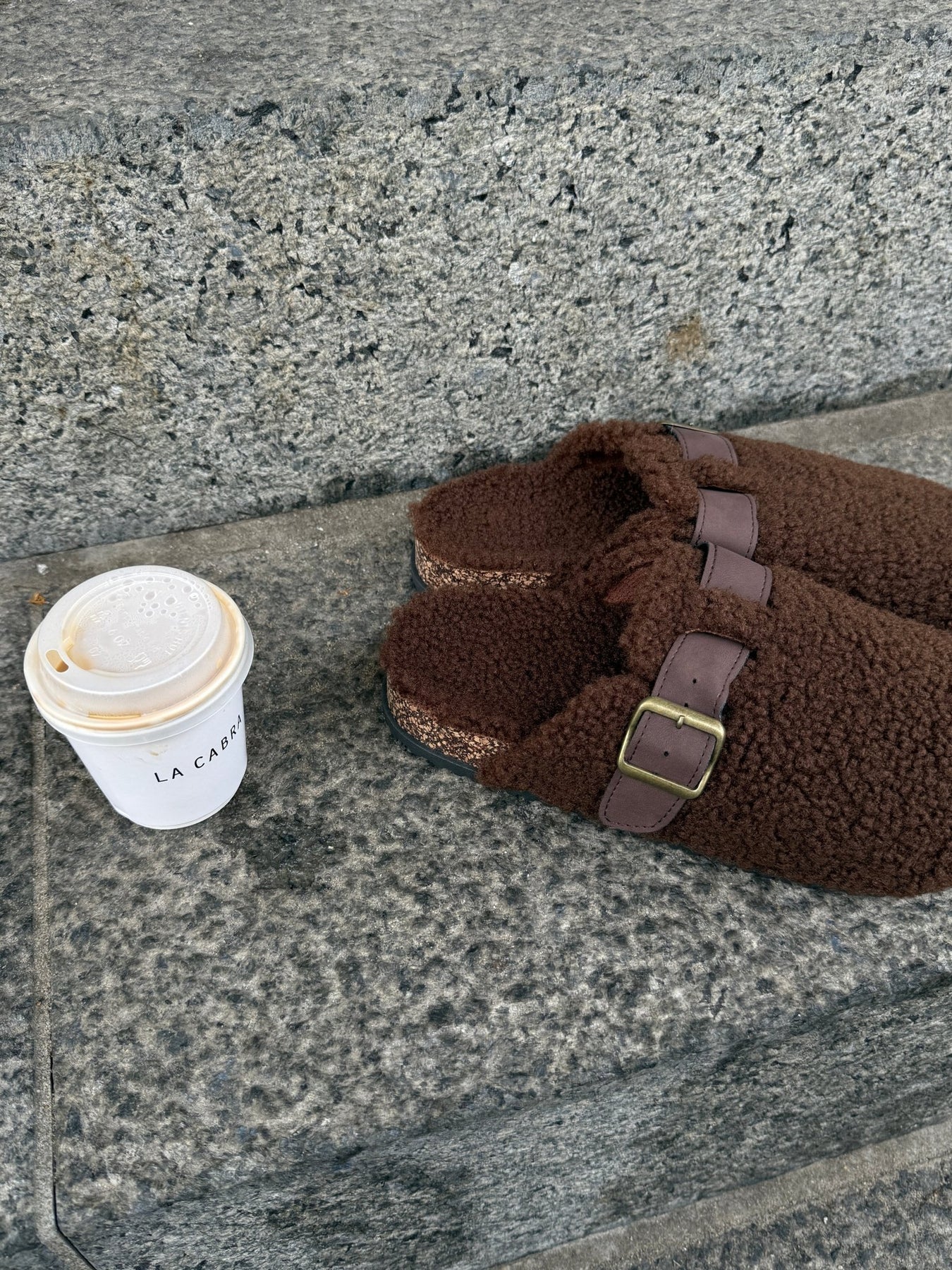 Disse brune slip-ins i teddy-look er det perfekte valg til kolde dage og indendørs hygge. Det bløde, pelslignende materiale omslutter foden med varme, mens den brede rem med spænde giver skoen et casual og moderne udtryk.