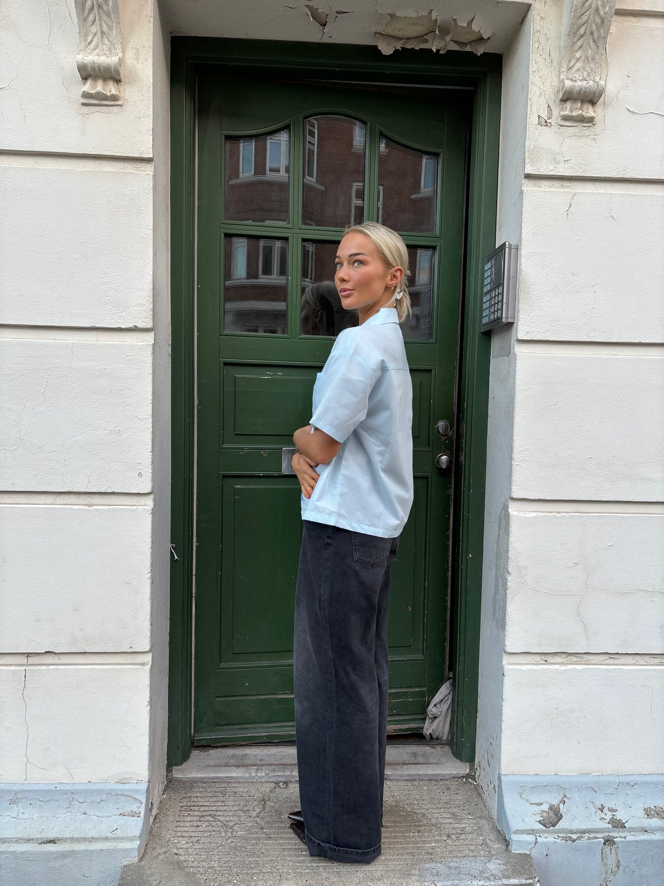 Den her lyseblå kortærmede skjorte er både let, luftig og super stilet. Den har en klassisk og afslappet pasform, der gør den perfekt til varme dage.