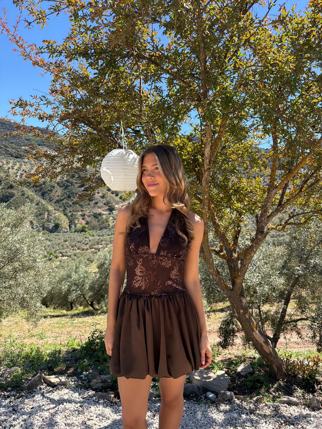Den dybe udskæring giver et sofistikeret touch, og den markerede talje fremhæver figuren på en flatterende måde. Perfekt til særlige anledninger, hvor du ønsker et look, der både føles luksuriøst og ubesværet.