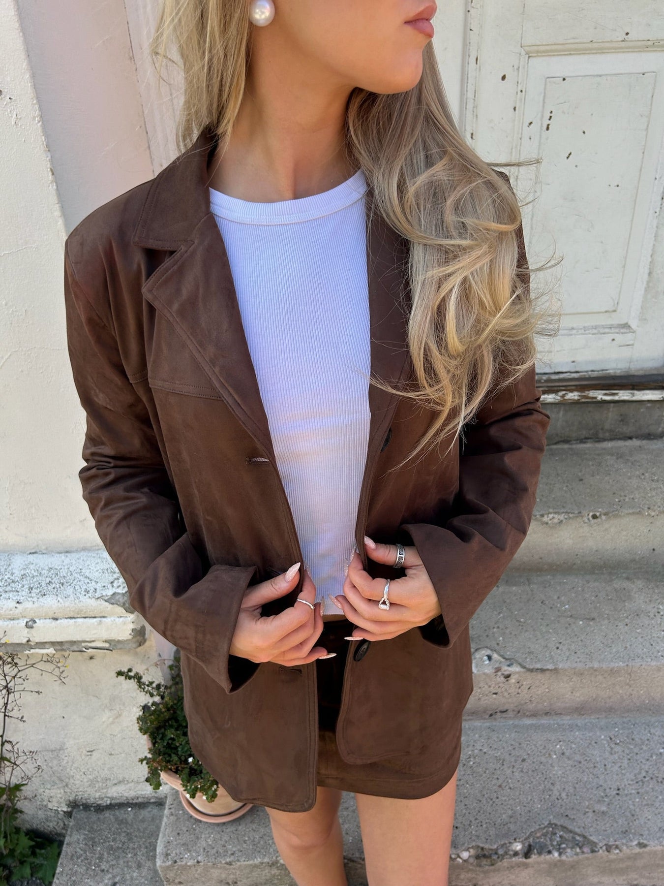 Den her blazer i faux suede er den perfekte tilføjelse til din efterårs- og forårsgarderobe. Den har et klassisk snit med lidt ekstra længde, fine knappedetaljer og lommer foran, som giver den et afslappet og cool udtryk. Materialet føles blødt og lækkert, og giver den helt rigtige retro-feel uden at gå på kompromis med komfort.