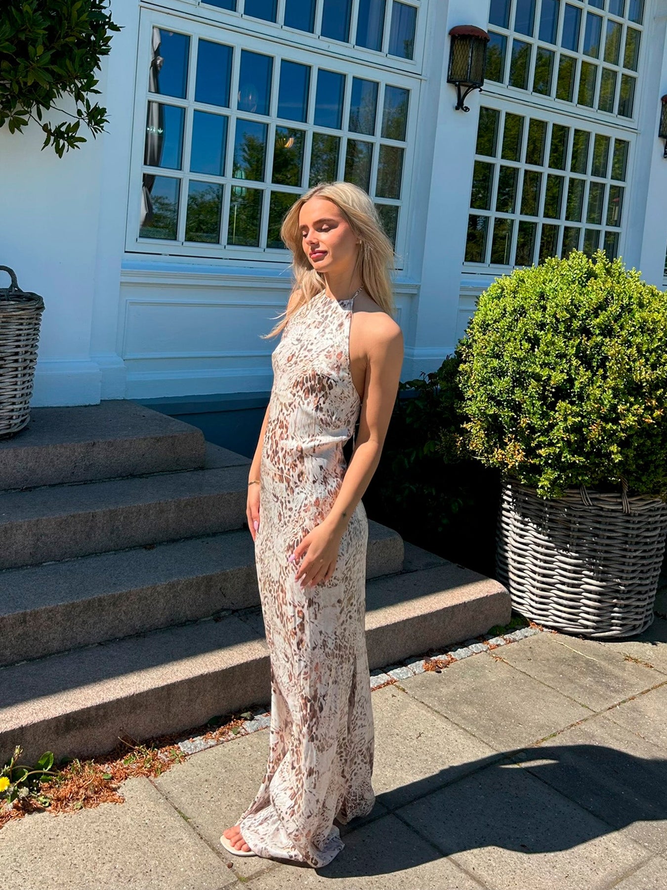 Med sin elegante halterneck og lette, flydende pasform er denne kjole perfekt til varme dage og lune sommeraftener. Stoffet er super blødt og falder smukt om kroppen, mens det fine mønster i neutrale toner giver kjolen et eksklusivt, men stadig afslappet look.