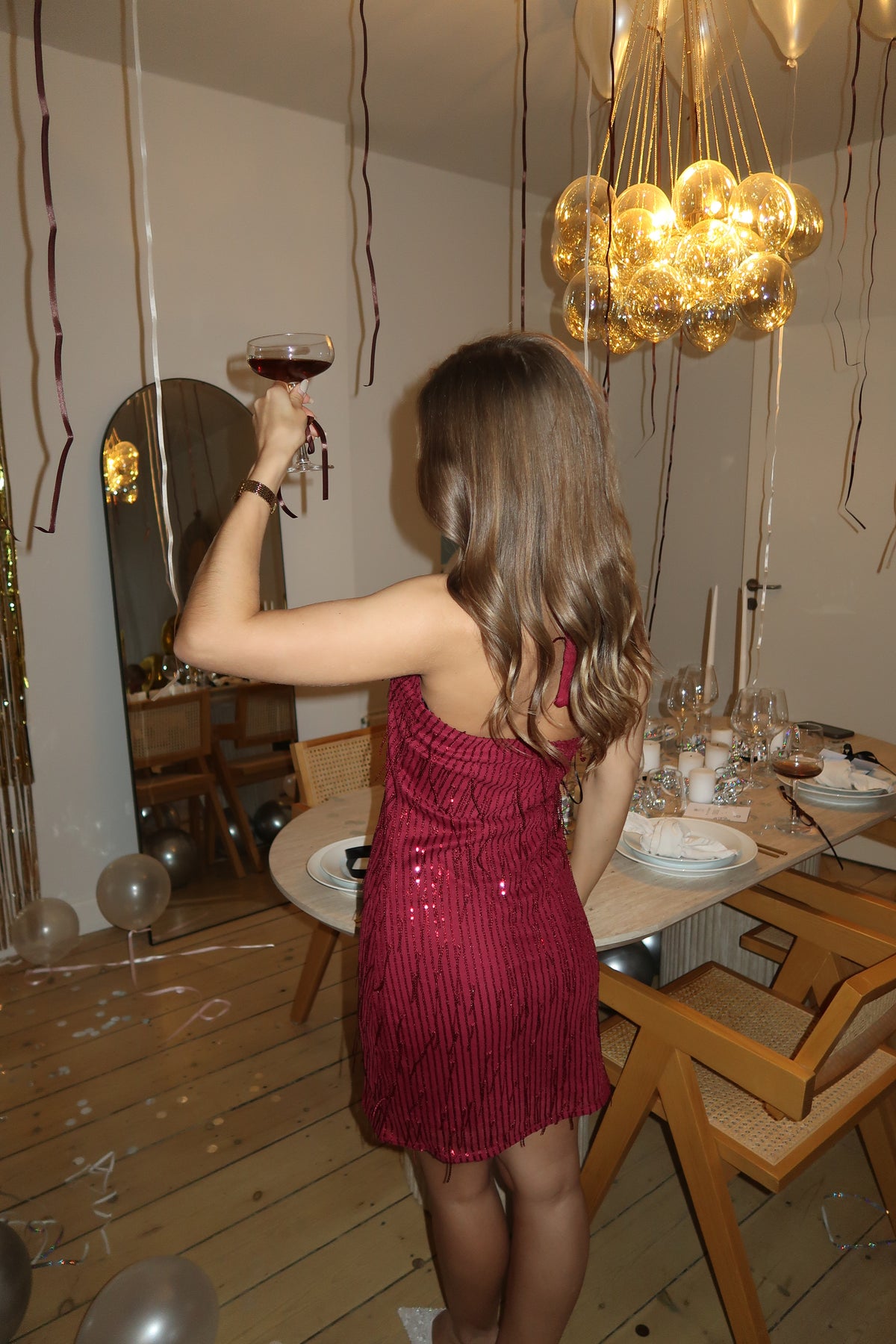 Oplev den ultimative nytårskjole, der kombinerer glimmer med elegance! Denne røde kjole er dækket af funklende palietter, der giver et strålende look og fanger lyset fra alle vinkler – perfekt til at fejre nytåret eller en anden festlig anledning.