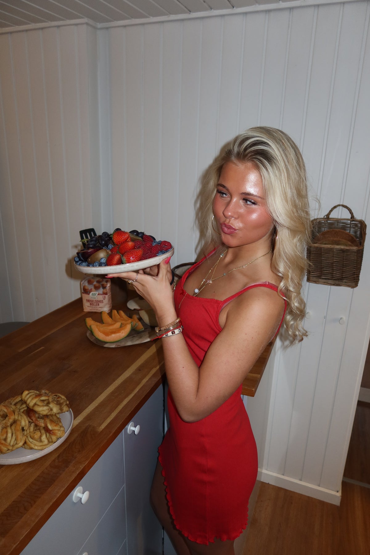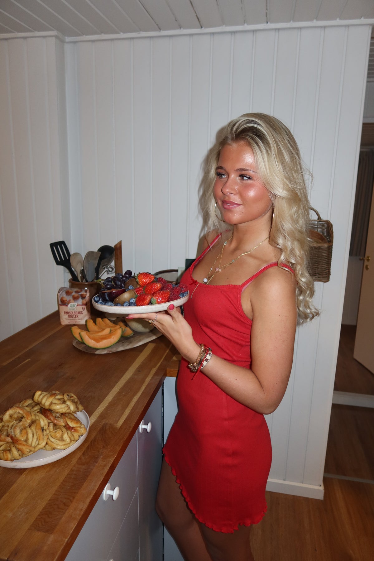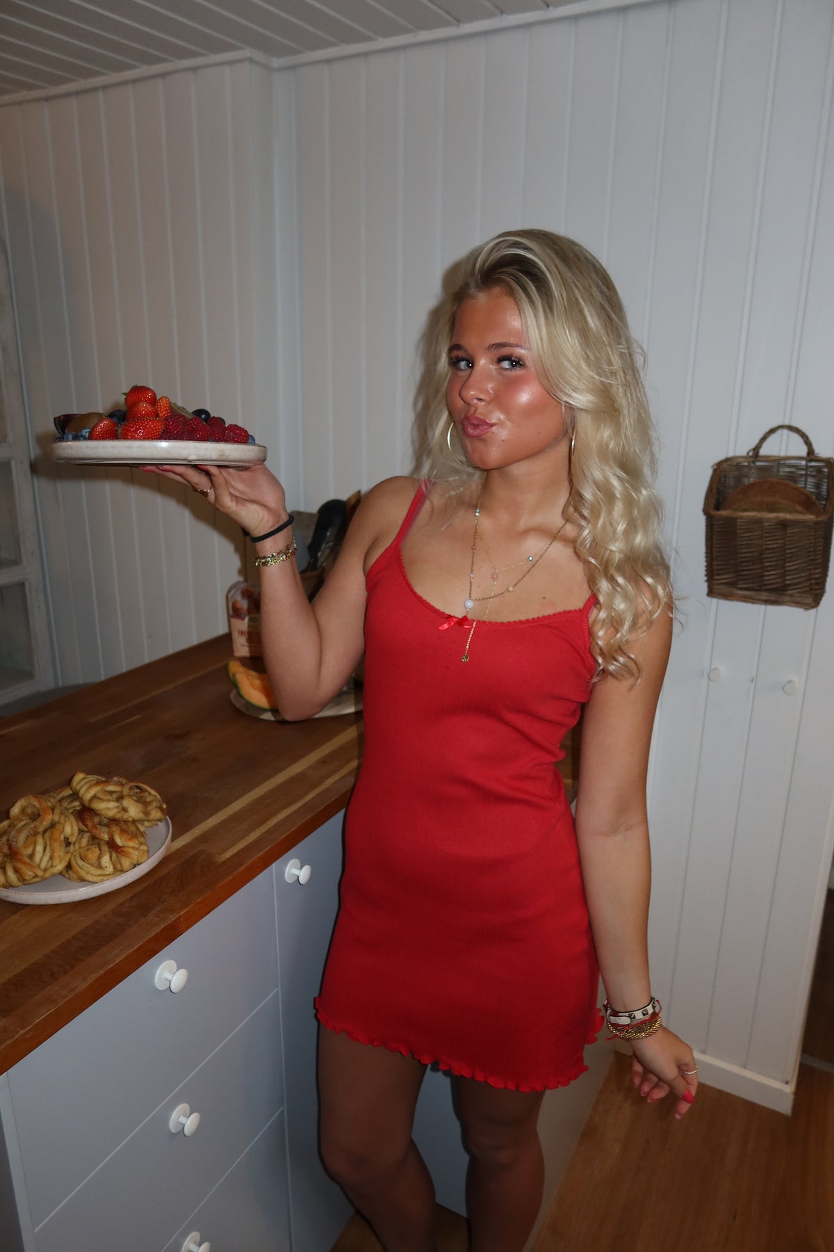 Denne smukke mini kjole kombinerer komfort og stil i ét. Kjolen er lavet i et blødt materiale med en diskret struktur, der fremhæver figuren på en naturlig og elegant måde. De tynde stropper og den lille sløjfe-detalje foran giver et feminint og romantisk udtryk, mens den let bølgede kant forneden tilføjer et legende touch.