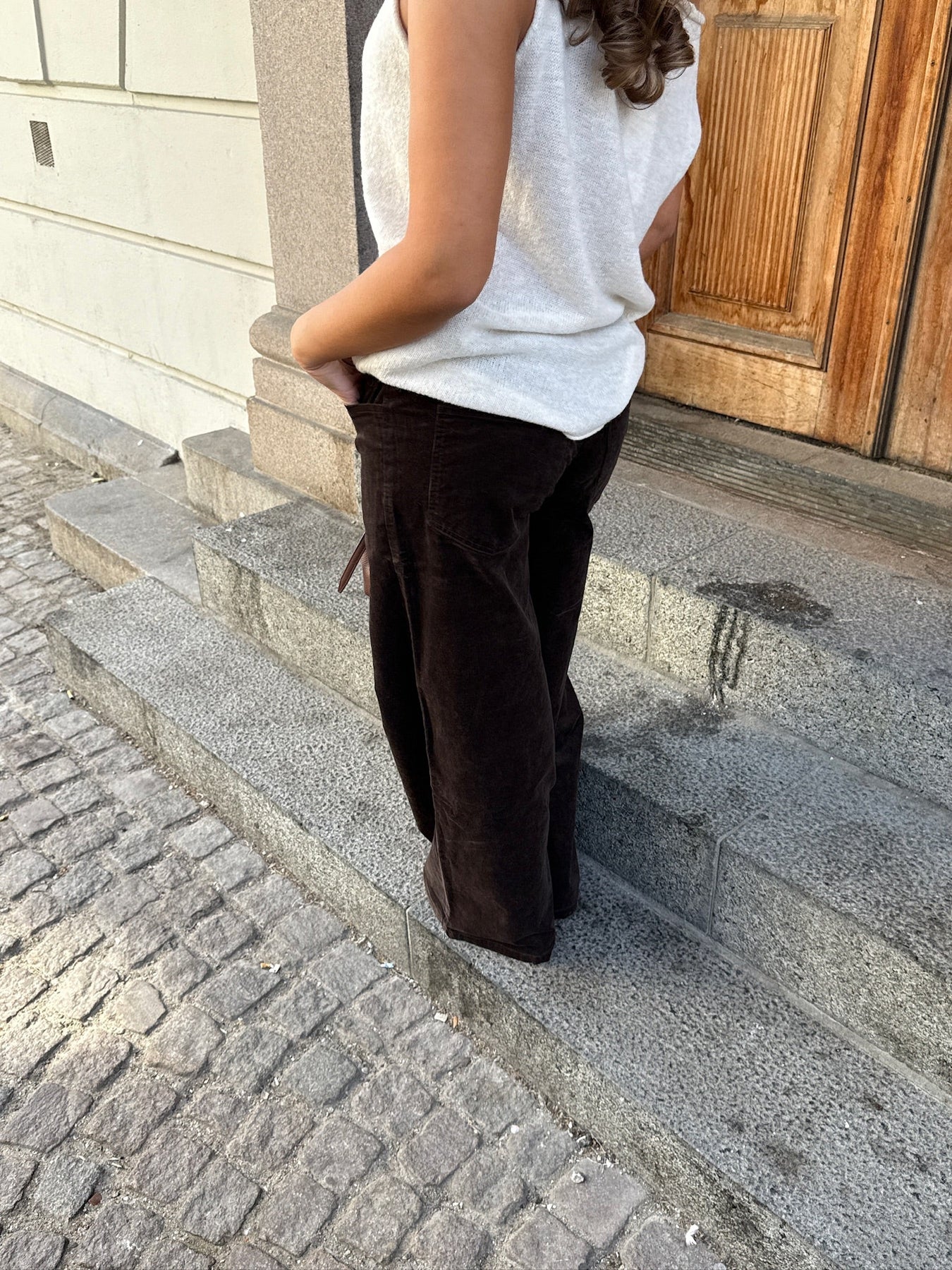 Disse brede fløjlsbukser i en blød mørkebrun nuance er den perfekte kombination af komfort og cool. Bukserne har en afslappet pasform med højtalje og brede ben, som skaber et moderne og ubesværet look. Det bløde corduroy-materiale tilføjer tekstur og varme, hvilket gør dem ideelle til både efterår og forår – men også perfekte året rundt med det rette styling.
