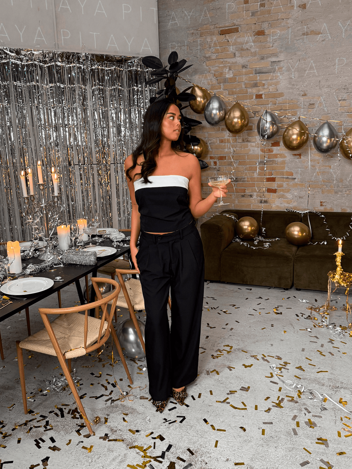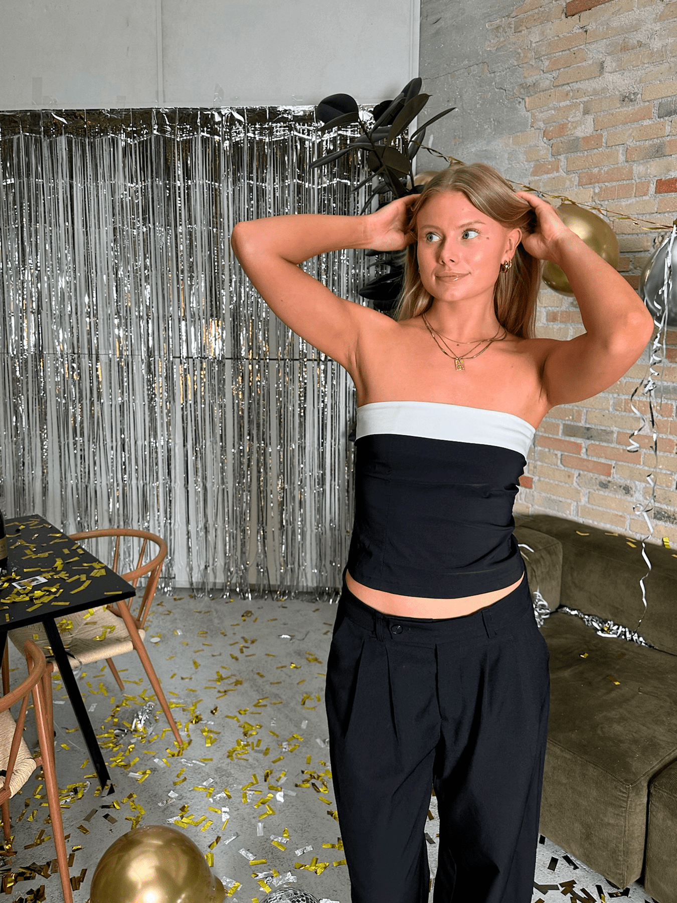 Denne sorte tupe top med et smukt, foldet stykke i hvidt er den perfekte kombination af enkelhed og elegance – ideel til både fest og nytårsaften. Toppen har en tætsiddende pasform, der fremhæver din figur, mens den lette og fleksible struktur gør den behagelig at have på hele aftenen. Den enkle, men stilfulde design gør den nem at style med alt fra en højtaljet nederdel til et par smarte bukser, og den kan nemt opgraderes med statement smykker eller en flot clutch.