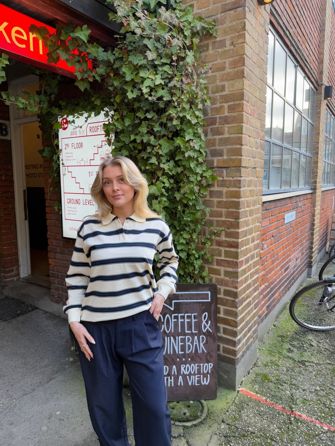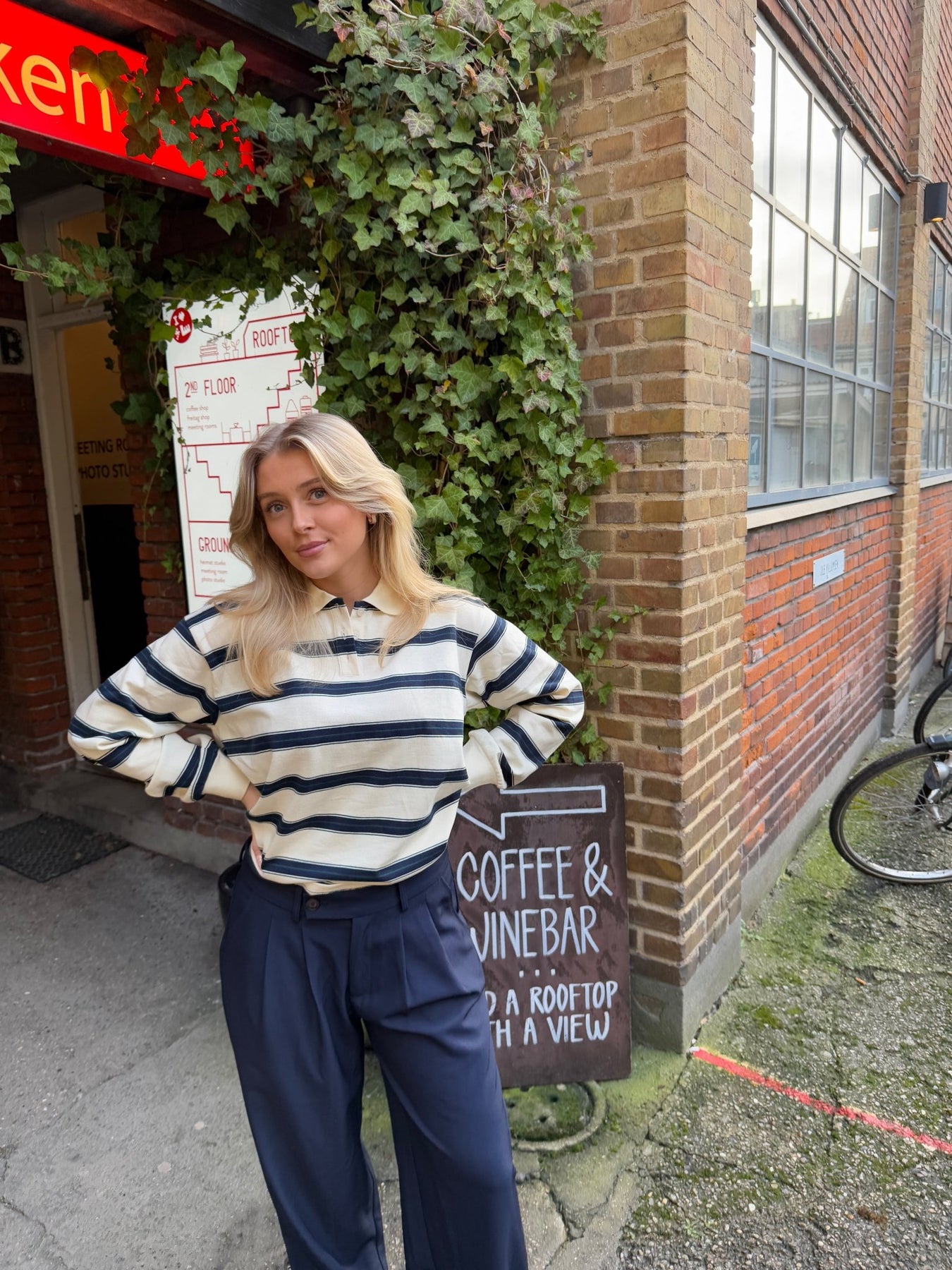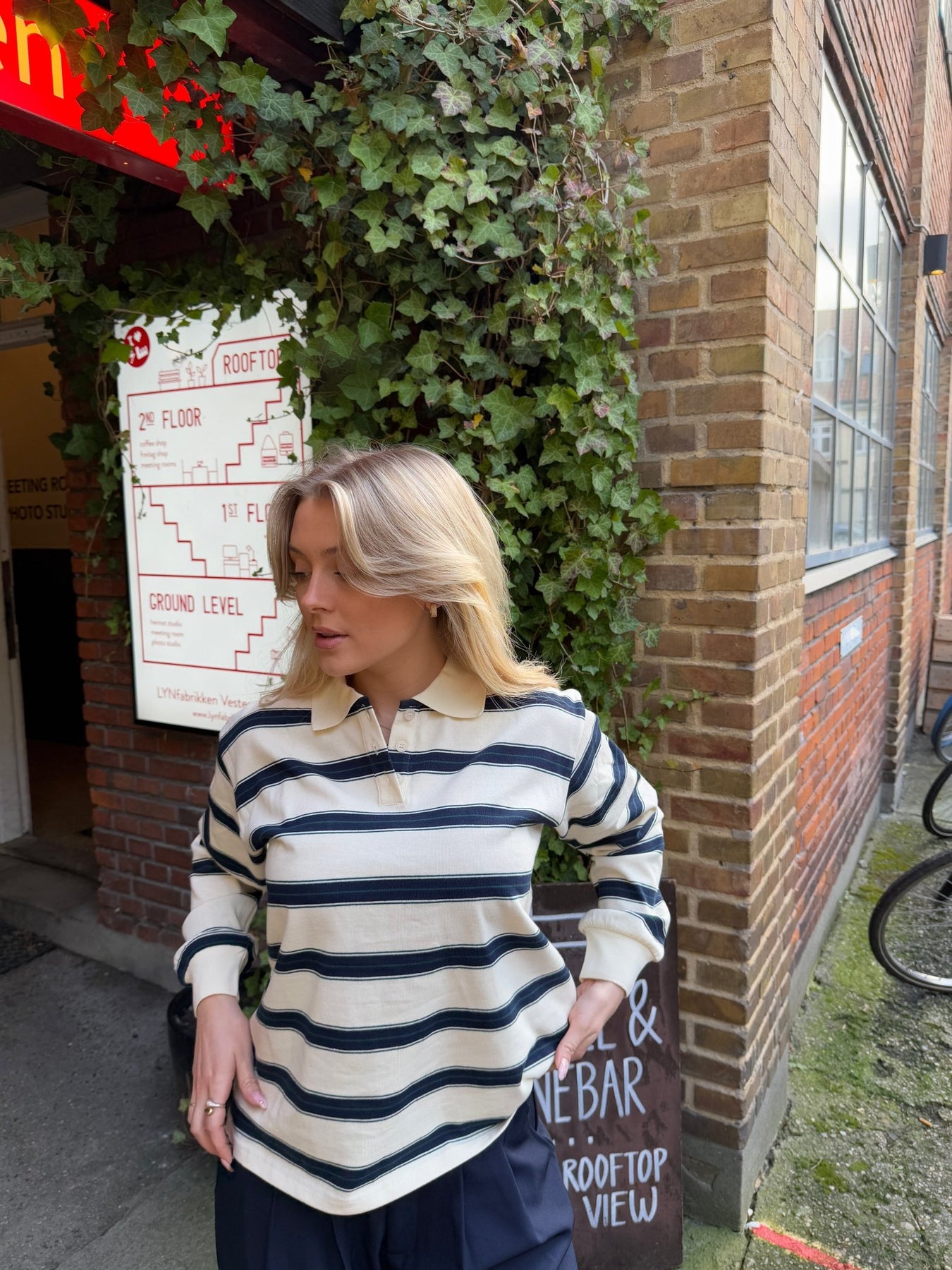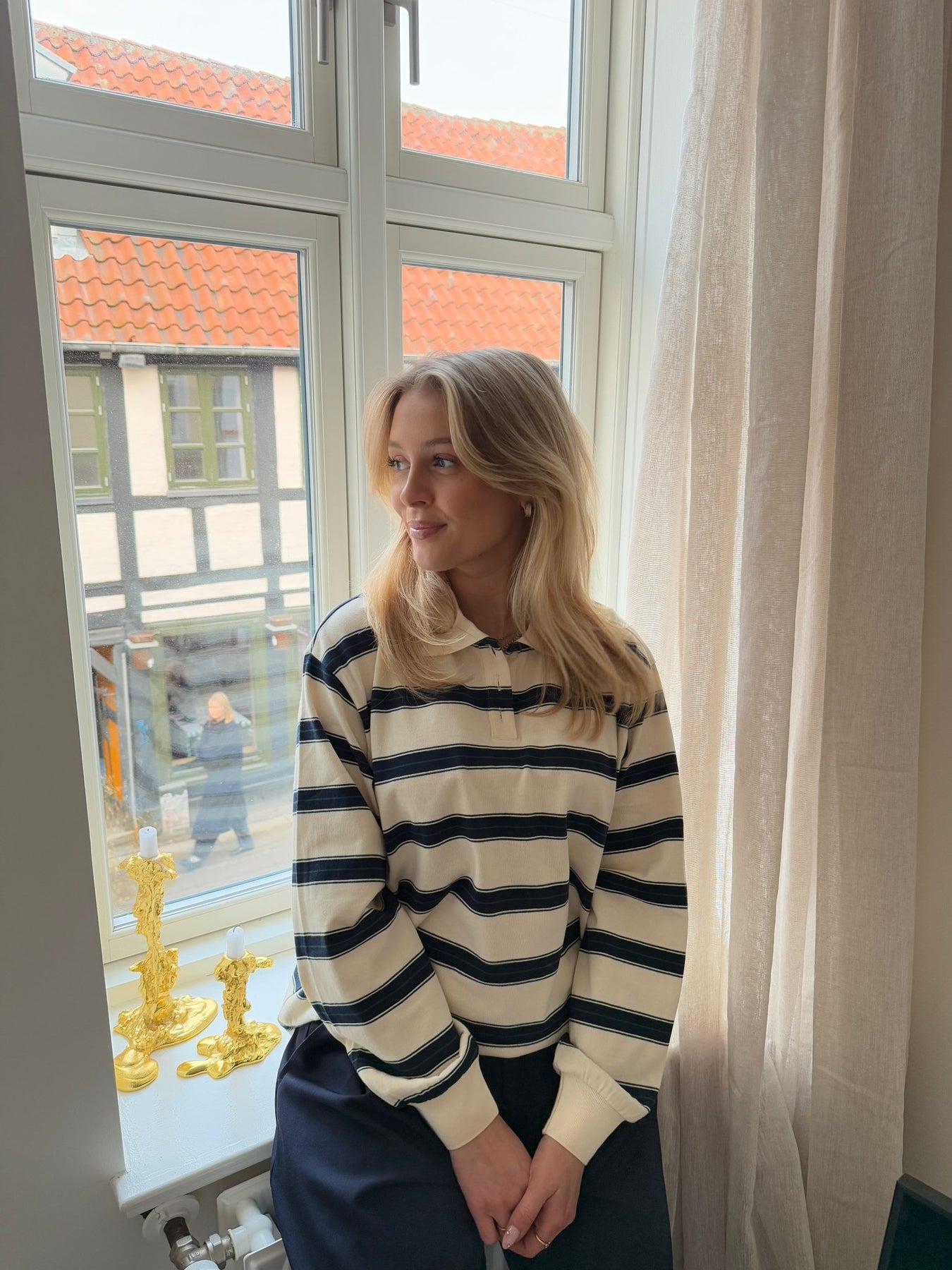 Denne langærmede polo er både komfortabel og stilfuld. Med flotte stribedetaljer i flere farver får du et ekstra pift til din garderobe. Lavet i blødt bomuld, der gør den behagelig at have på hele dagen. Perfekt til både afslappede og lidt mere elegante looks.
