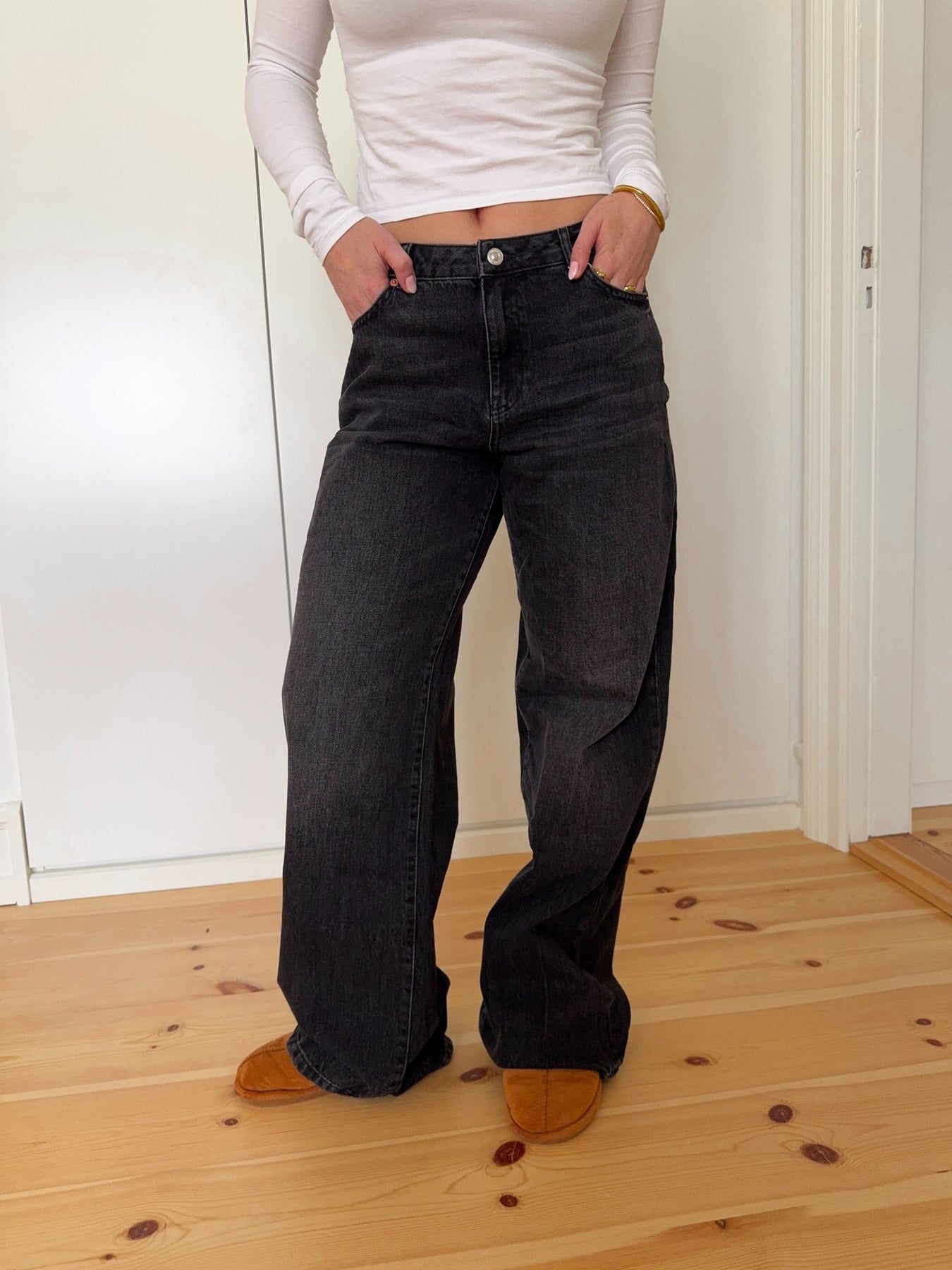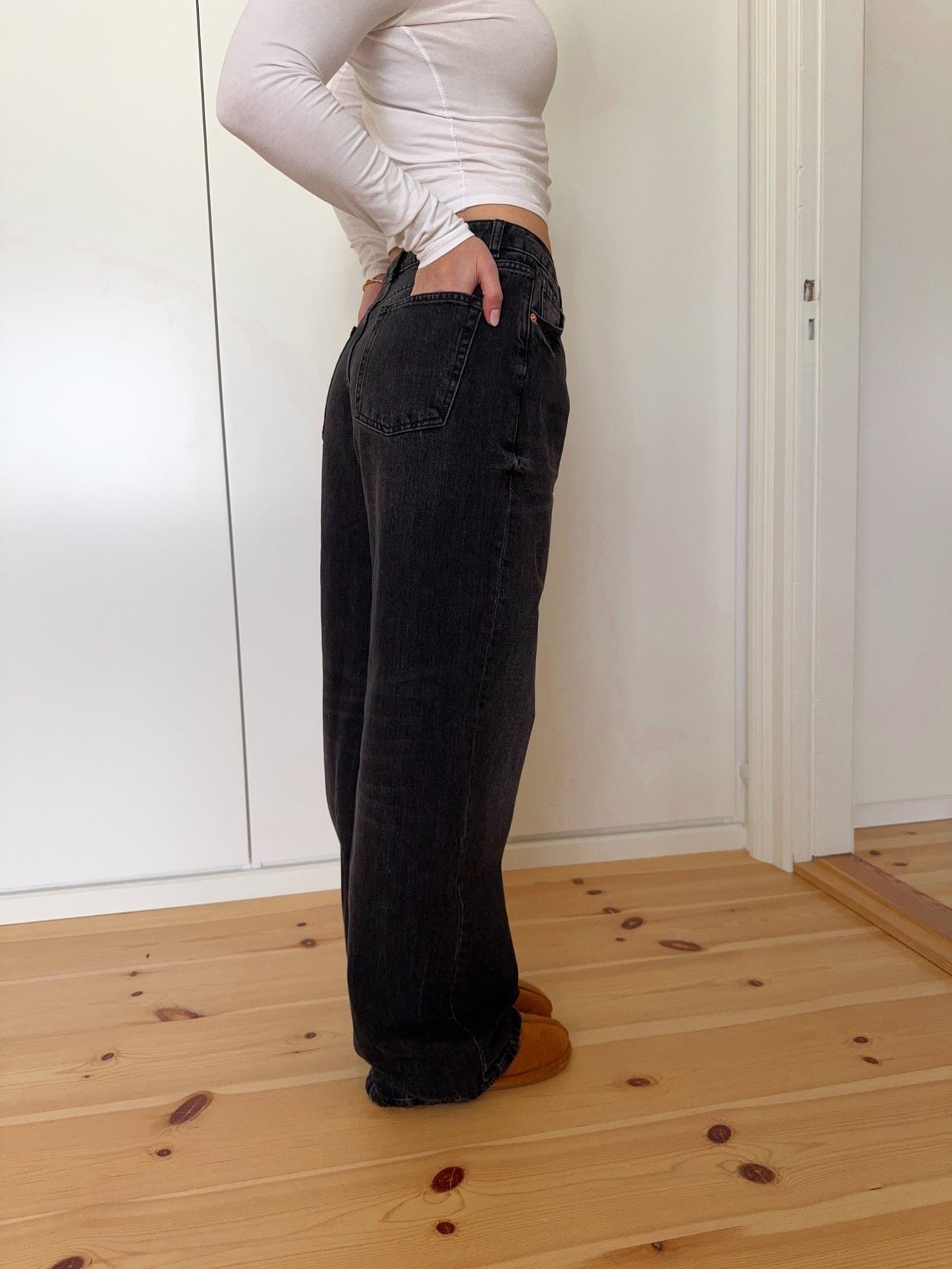 - Pasform: Wide leg / relaxed fit