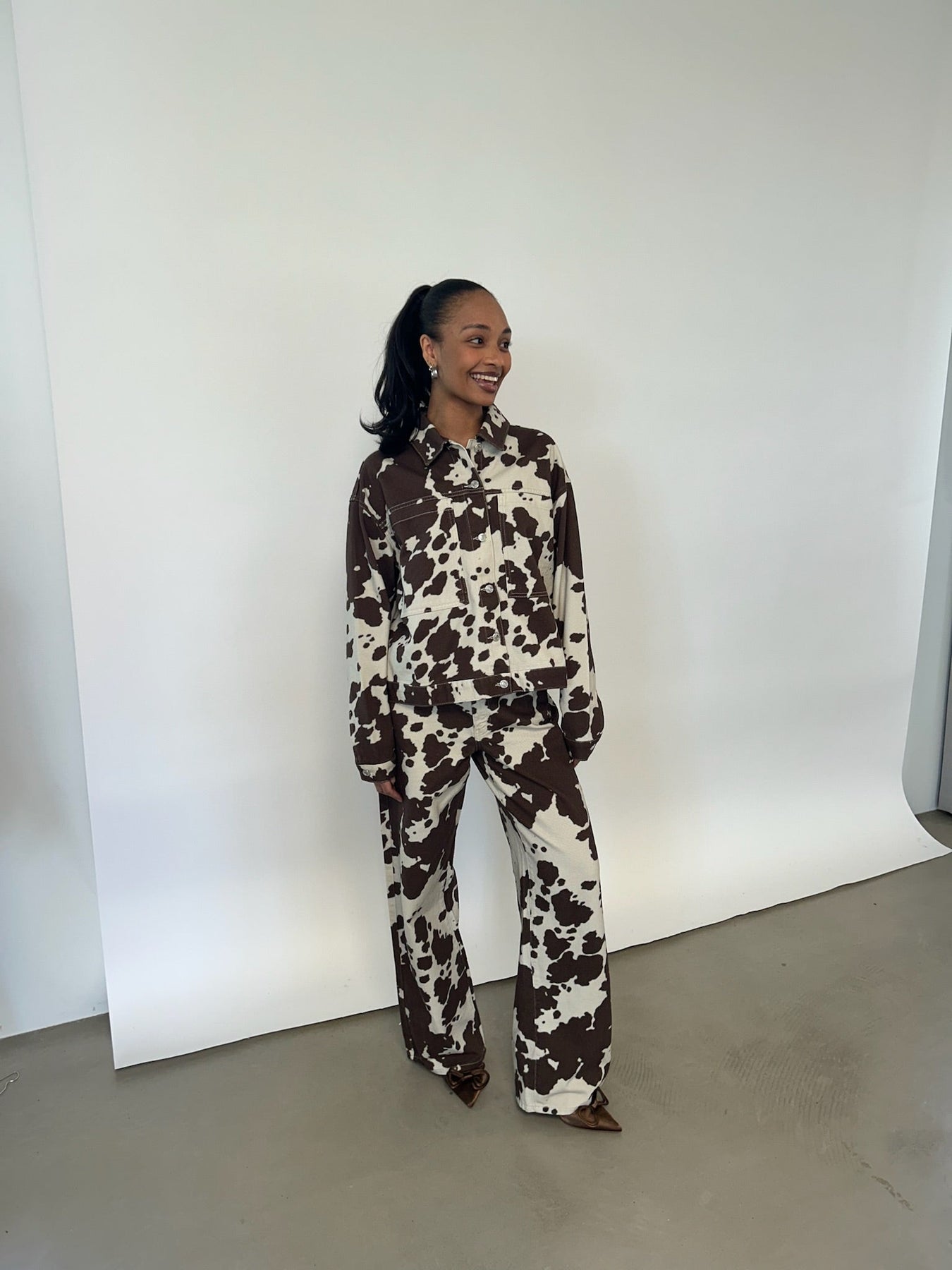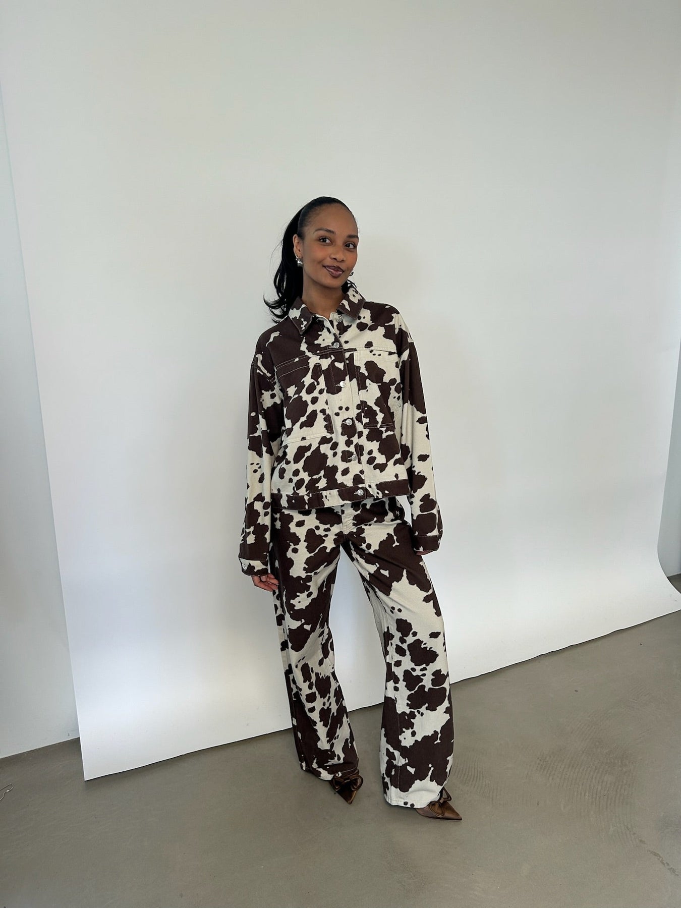 Her er sættet, der tager denim til et helt nyt niveau! Matchende jeans og jakke i det blødeste denim med det sejeste ko-print – et look, der både er sjovt, cool og helt sin egen.