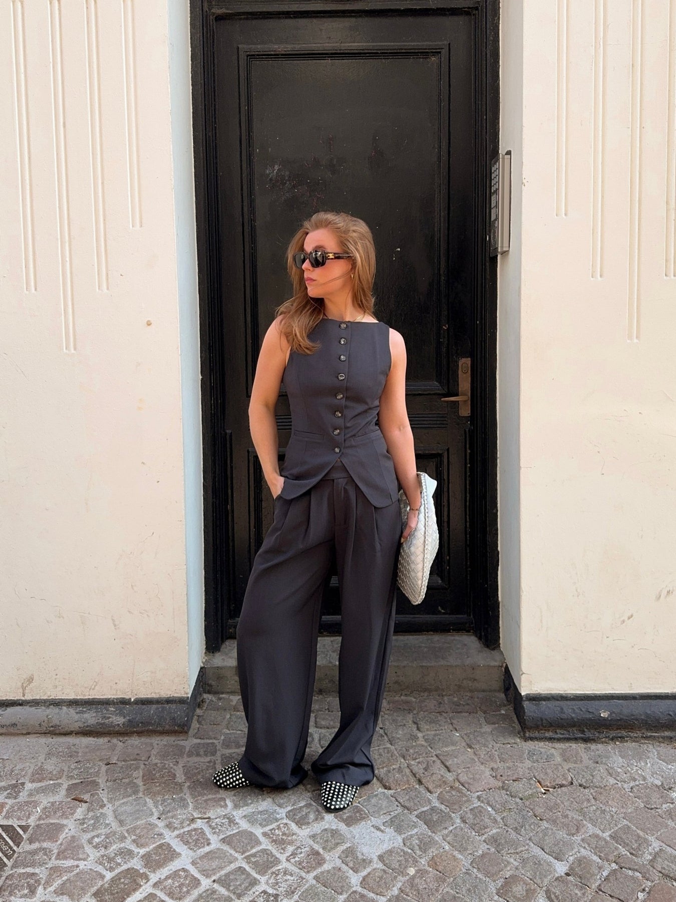 Dette lækre sæt består af habitbukser i en lidt oversize stil, der giver et moderne og afslappet look, samtidig med at de bevarer den klassiske elegance. Bukserne er perfekte til både hverdag og fest, og den lette pasform gør dem super komfortable. Den elegante vest, med knapper ned langs foran, tilføjer et sofistikeret touch til sættet og skaber et skarpt, men stilfuldt udtryk. Dette sæt er ideelt til dig, der vil have noget tidløst og samtidig trendy – det kan nemt styles til både formelle og afslappede anledninger.