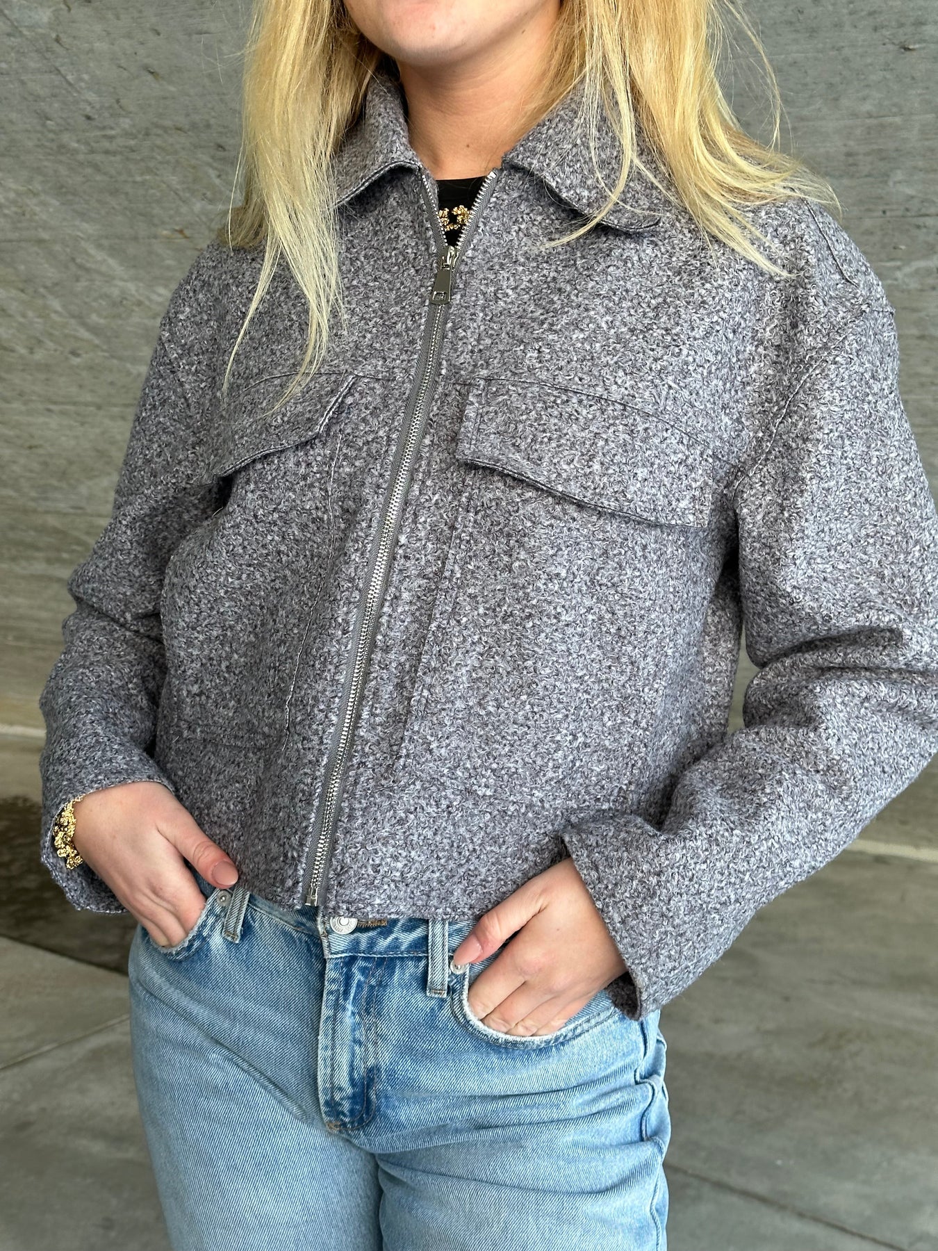 Grå bomberjakke med to lommer omme foran. Jakken har lynlås og et skjortelook i kraven.