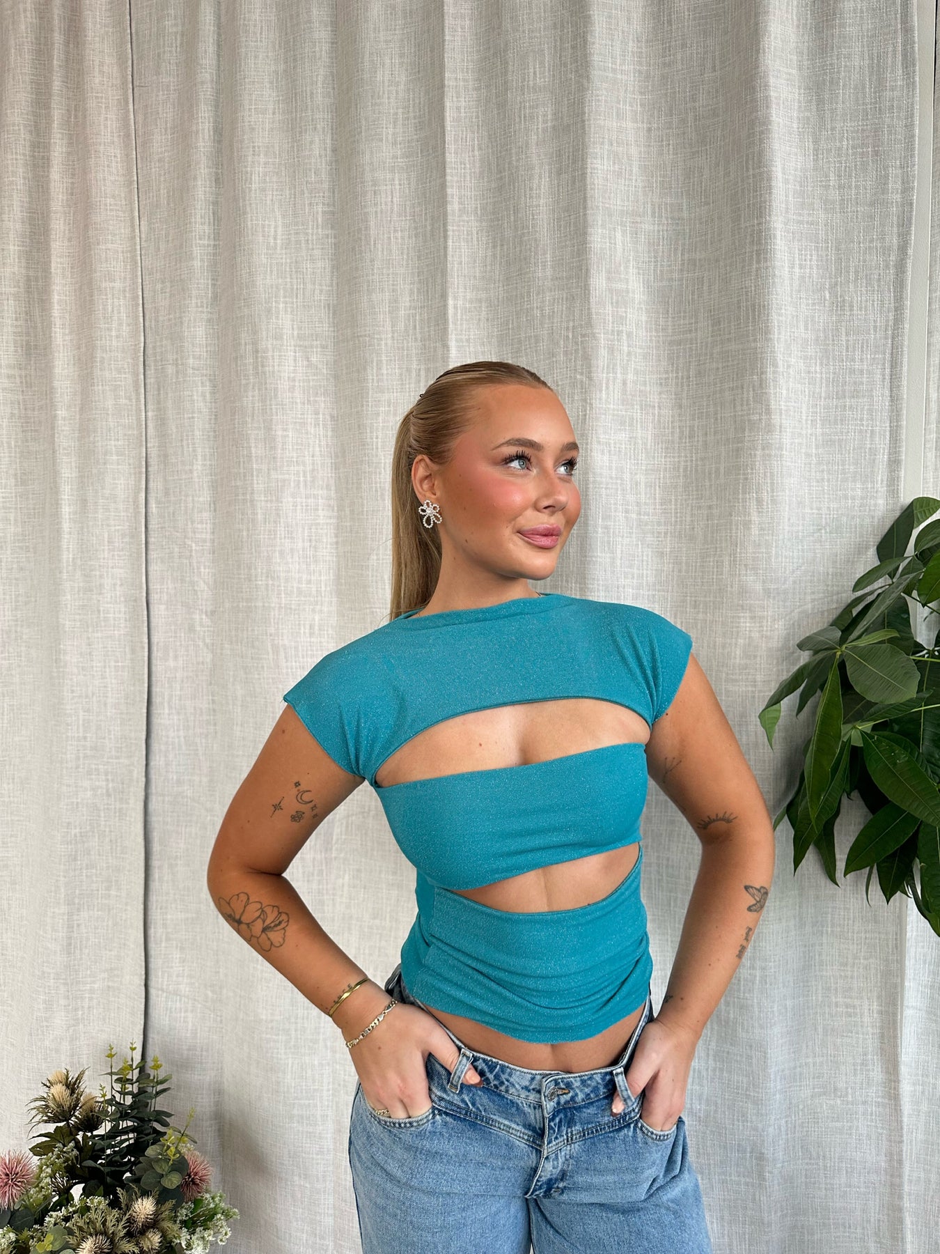 Kortærmet top med åbne detaljer. Vores Zoph Top er en fin og elegant top, som kan vendes efter brug. Toppen kan både bæres med de åbne detaljer foran og bagved og er den perfekte trøje til enhver begivenhed. Toppen har en stram pasform.