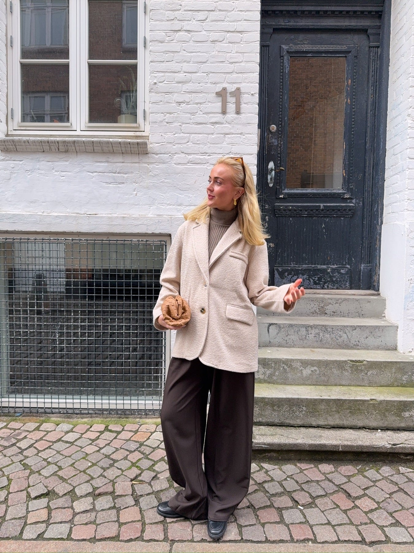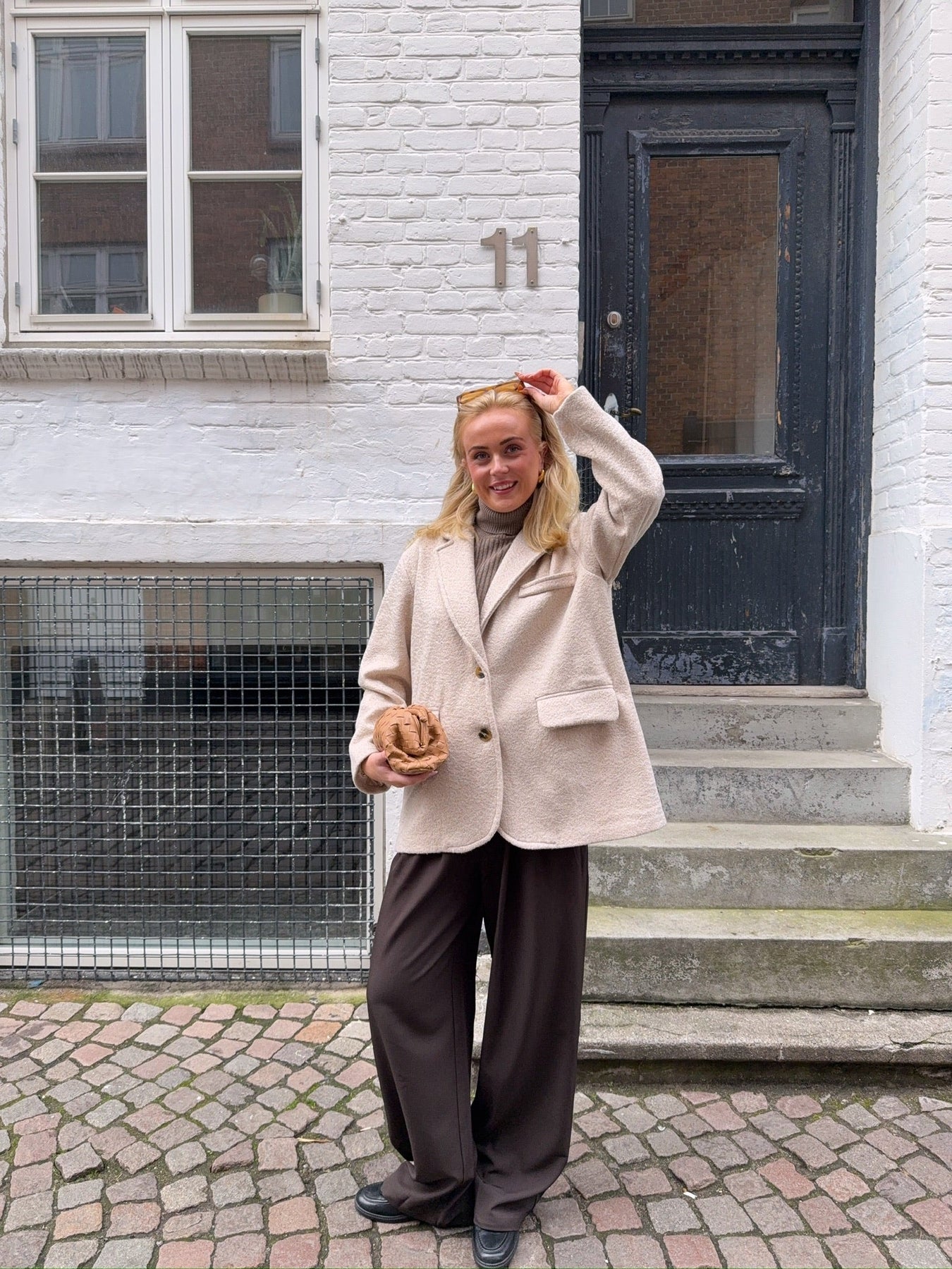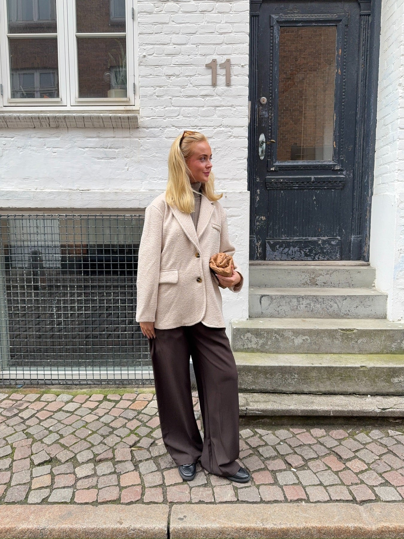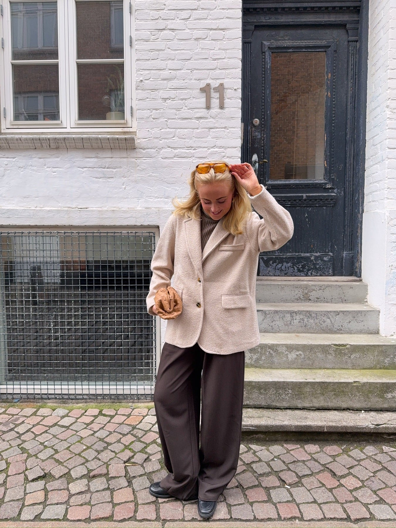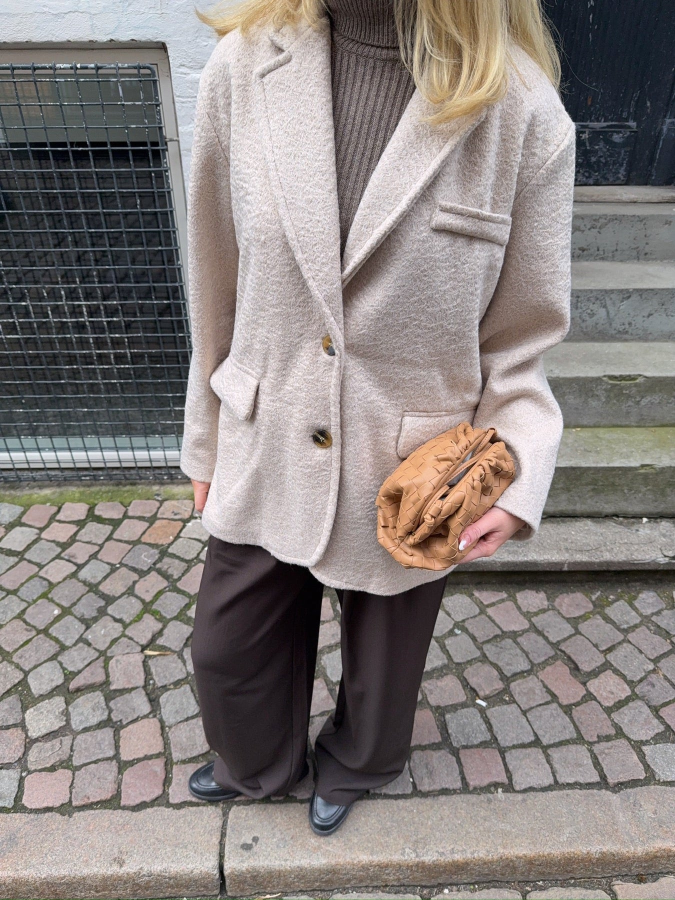 Den her blazer er lavet i et virkelig lækkert og blødt materiale, som både ser godt ud og er super behageligt at have på. Den har to knapper foran og lommer i siderne – klassisk og nem at bruge til det hele.