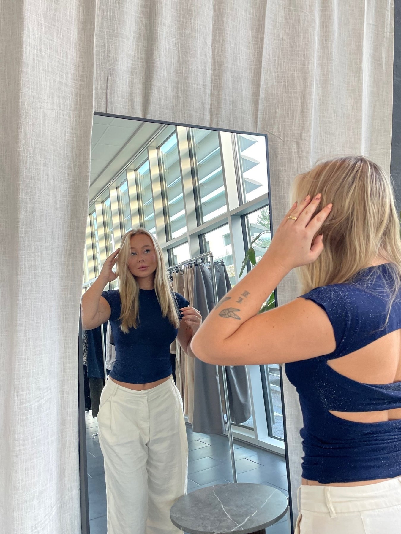 Sofie is 174 cm tall and wears a size S. The top is the regular size.