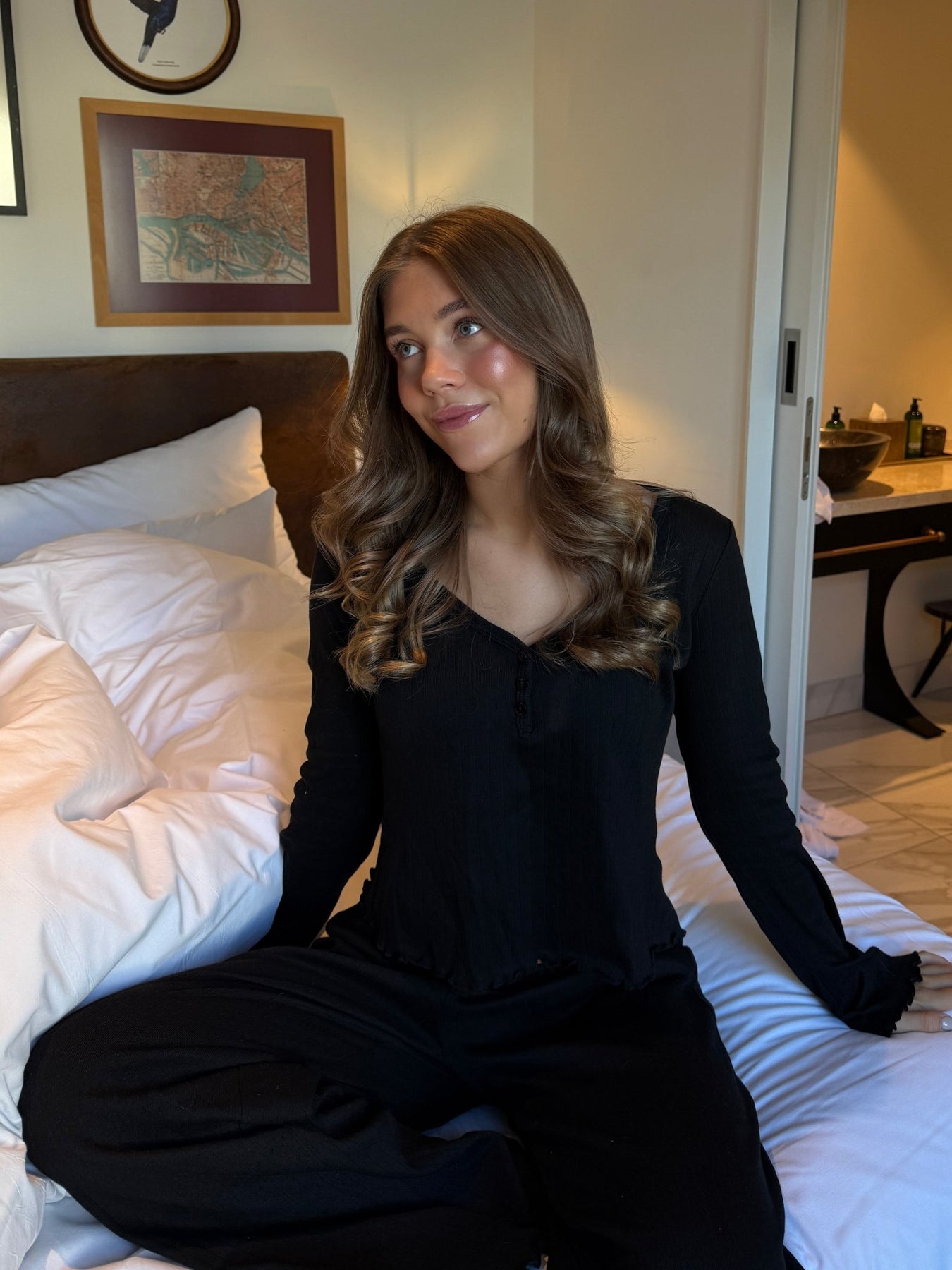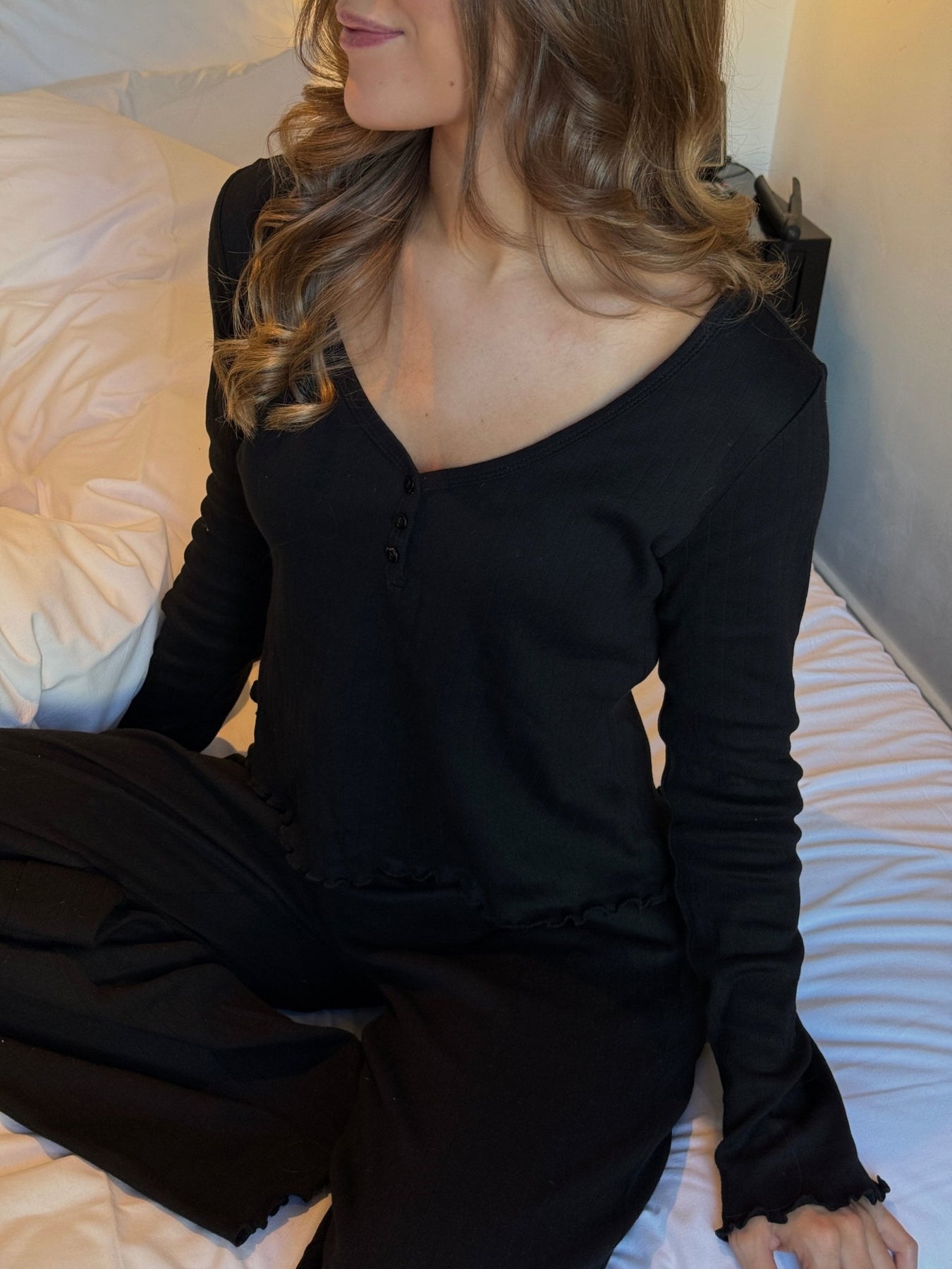 Den her bløde loungewear top er det ultimative go-to, når komfort og søde detaljer skal gå hånd i hånd. Den er lavet i et let ribbet materiale med små teksturdetaljer og har en feminin flæsekant ved både ærmer og bund. De små knapper foran og den lette v-udskæring giver et ekstra touch af hygge og stil.