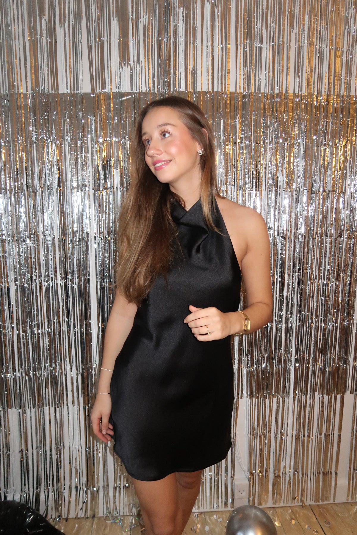 Elegant, tidløs og uimodståeligt chic – denne sorte satin kjole er det ultimative valg til særlige lejligheder. Den blanke overflade reflekterer lyset smukt og giver kjolen et eksklusivt udtryk, mens det minimalistiske design gør den både sofistikeret og sensuel.