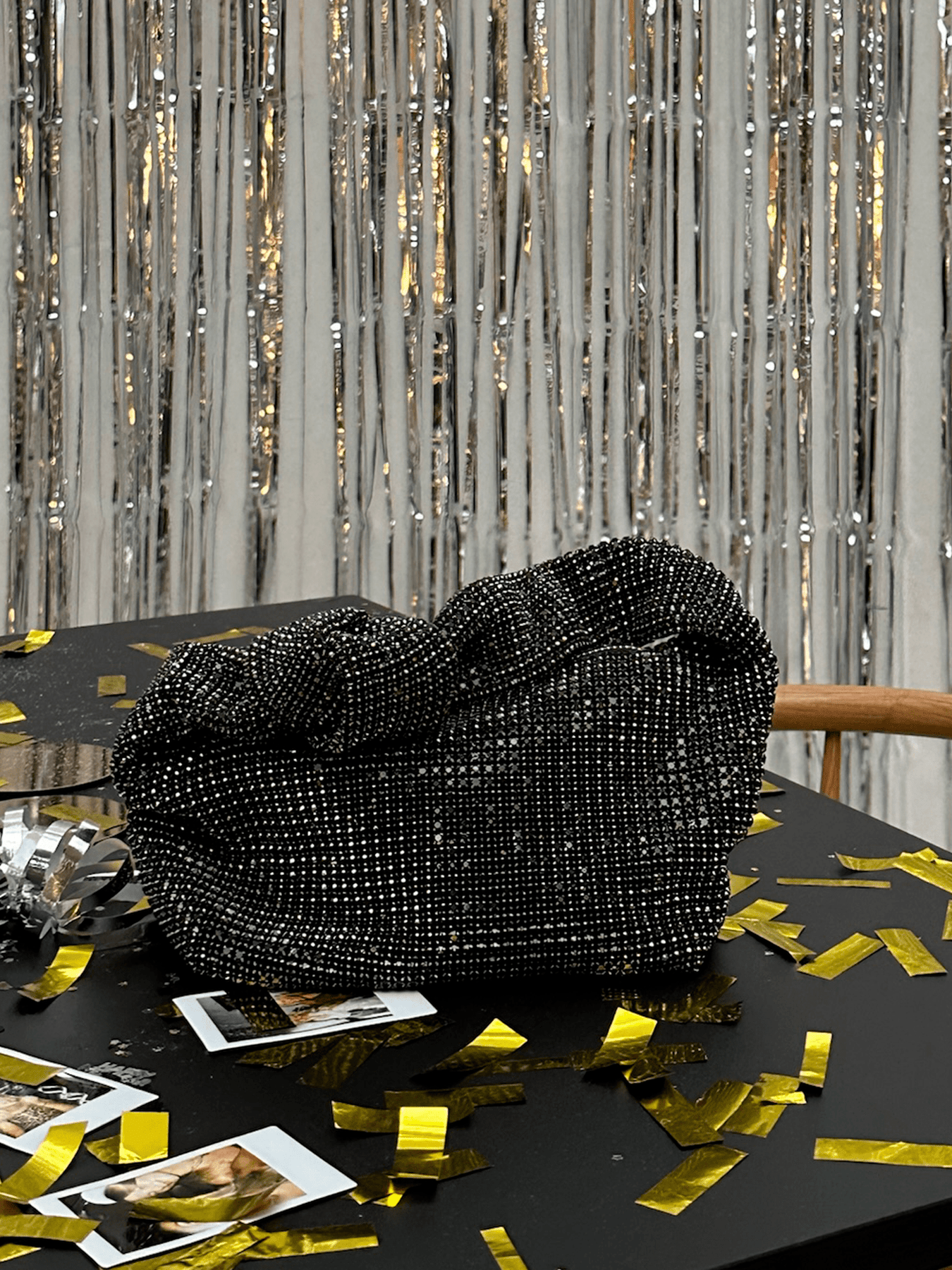 Denne lille håndtaske er det ultimative tilbehør til at fuldende dit festlook. Med sin smukke, funklende overflade i sort glitter fanger tasken lyset og skaber et uimodståeligt glamourøst udtryk. Den er perfekt til nytårsaften, festlige begivenheder eller enhver anledning, hvor du vil tilføje et strejf af luksus til dit outfit.