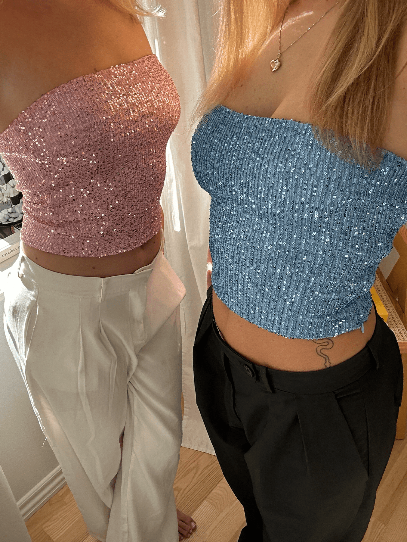 Fuldend dit nytårslook med denne fantastiske lyseblå glitter top, der er dækket af masser af glitrende palietter! Den fanger lyset og får dig til at stråle, uanset hvor du går. Perfekt til at danse hele natten – eller bare få opmærksomhed på den bedste måde!