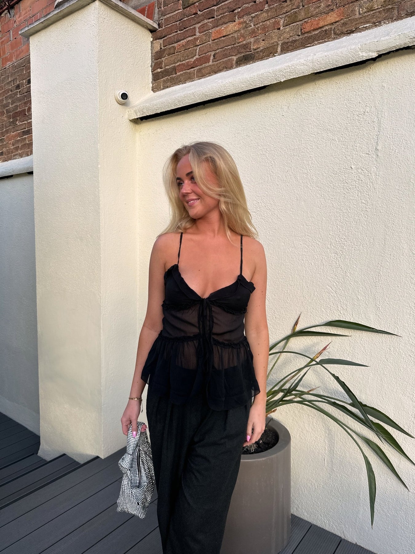 En let og feminin top med gennemsigtigt udtryk og fine flæser. De justerbare bindebånd foran og de tynde stropper skaber et romantisk look, der samtidig føles ubesværet og sommerligt.