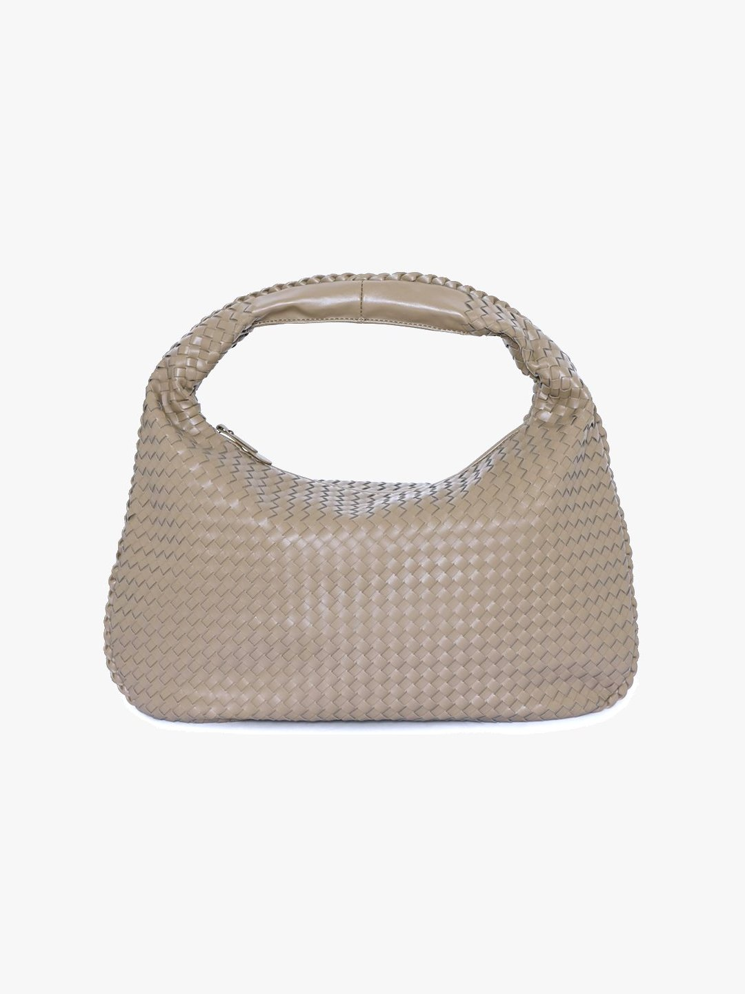 Tasken er en flettet skuldertaske. Tasken har et stort rum i midten med en lynlåslomme. Inde i tasken er to mindre rum med lynlås, og en stor åben lomme.