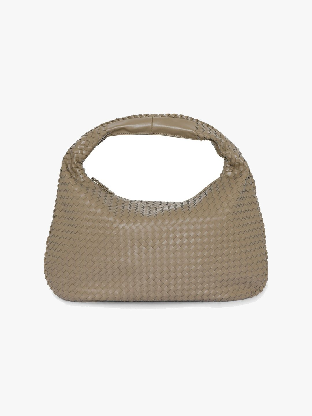 Tasken er en flettet skuldertaske. Tasken har et stort rum i midten med en lynlåslomme. Inde i tasken er to mindre rum med lynlås, og en stor åben lomme.