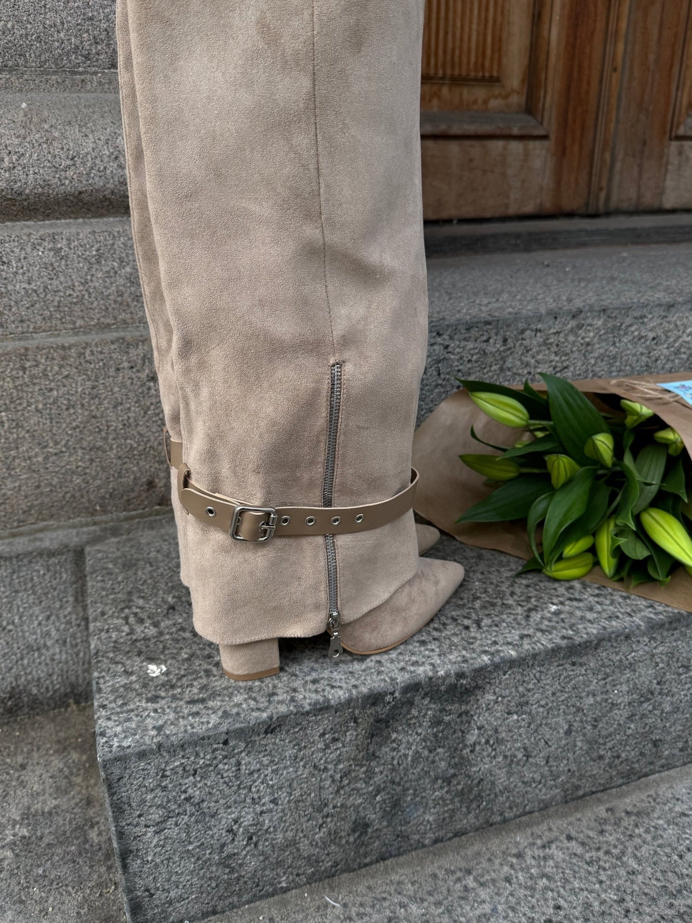 Vores Dagmar støvler i taupe er en knæhøj støvle fremstillet i imiteret ruskind med en løs pasform og markeret skaft. Designet er kendetegnet ved en dekorativ lynlås langs ydersiden og en bred rem med metalspænde omkring anklen, hvilket giver støvlen et moderne og råt udtryk.