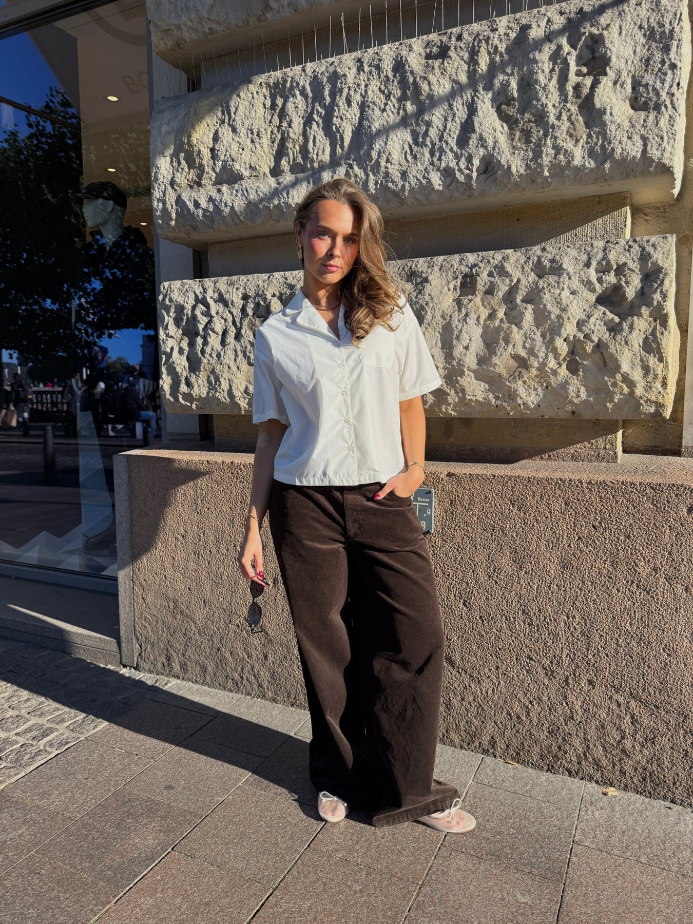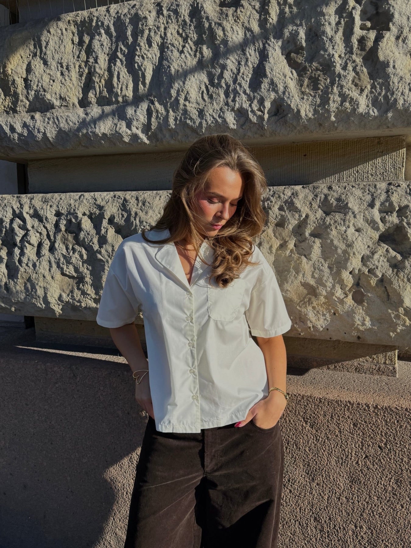 Den her hvide kortærmede skjorte er både let, luftig og super stilet. Den har en klassisk og afslappet pasform, der gør den perfekt til varme dage.