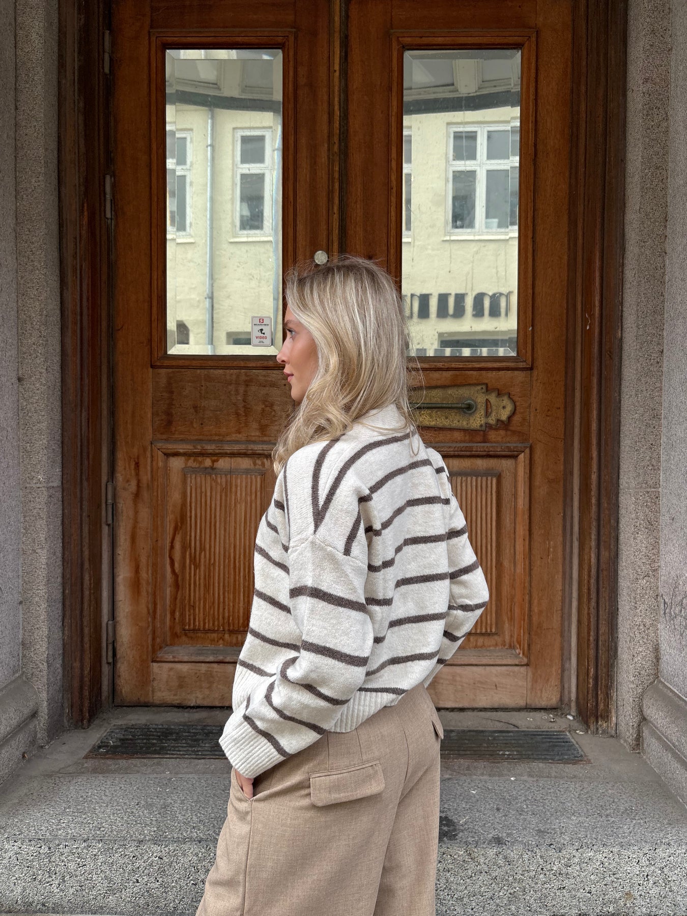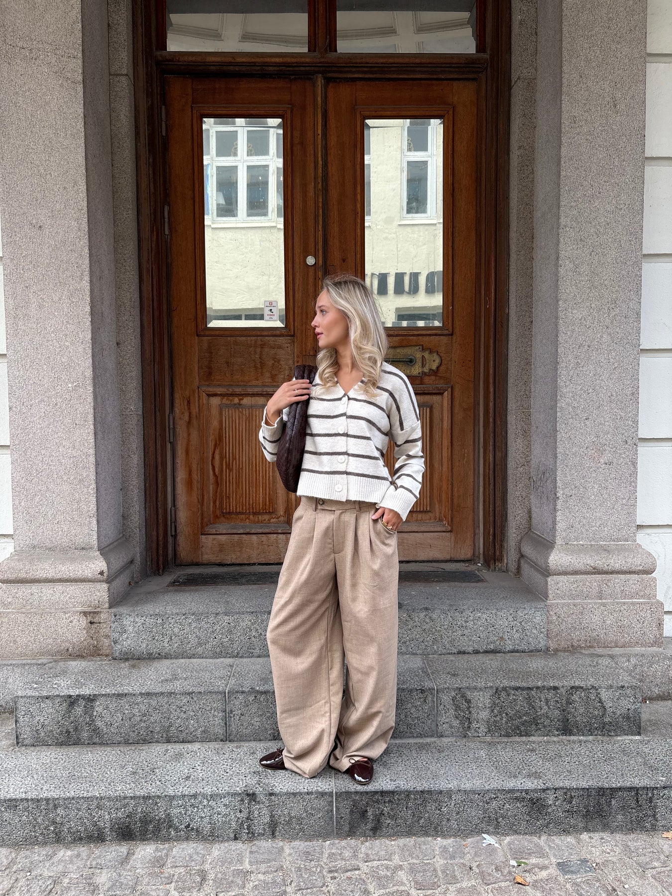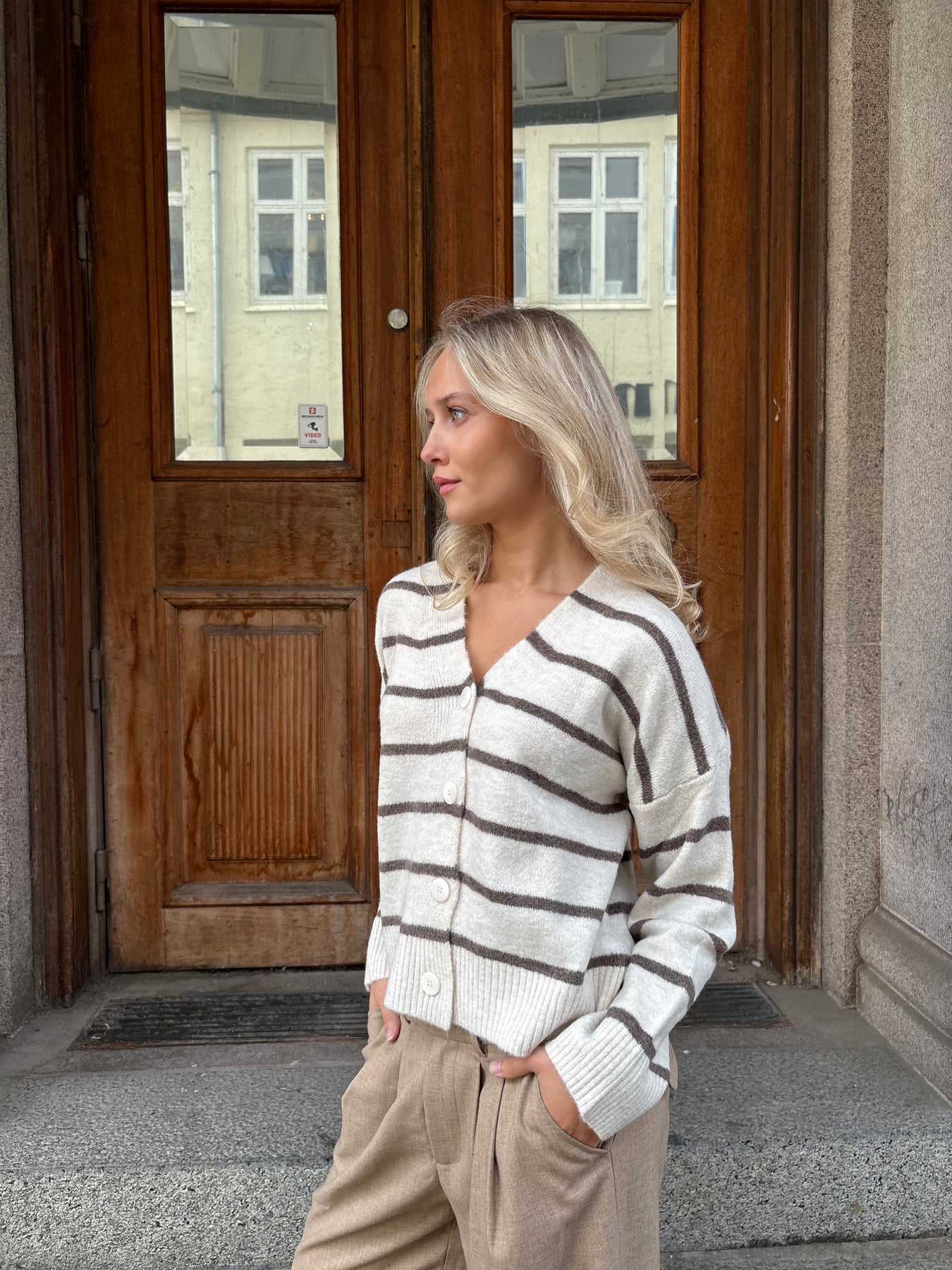 Denne cardigan er lavet i et lækkert blødt materiale, der føles virkelig behageligt mod huden – perfekt til både lange arbejdsdage og afslappede weekender. Den beige farve med de mørkeblå striber giver et cool og klassisk look, der er nemt at style til det hele.