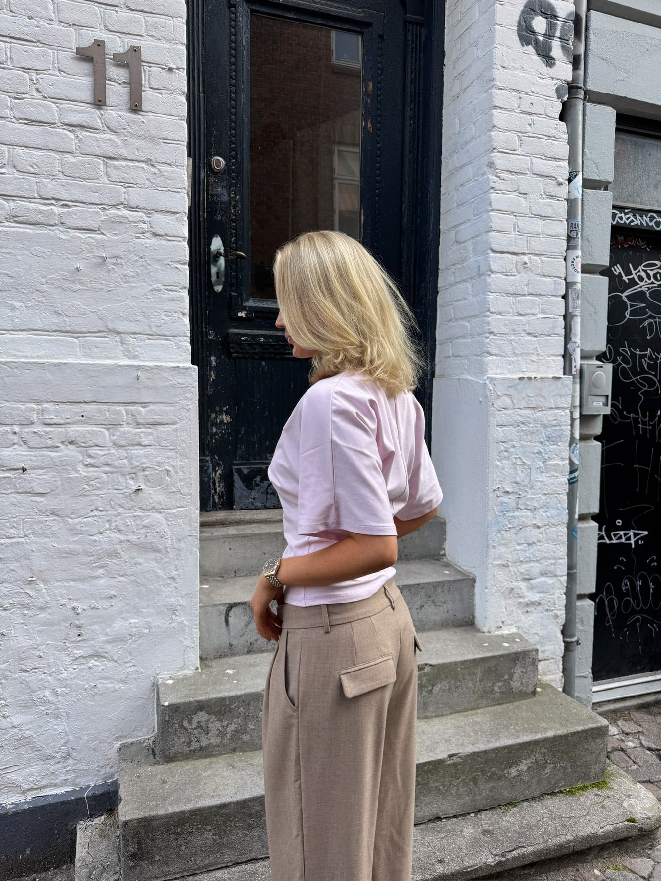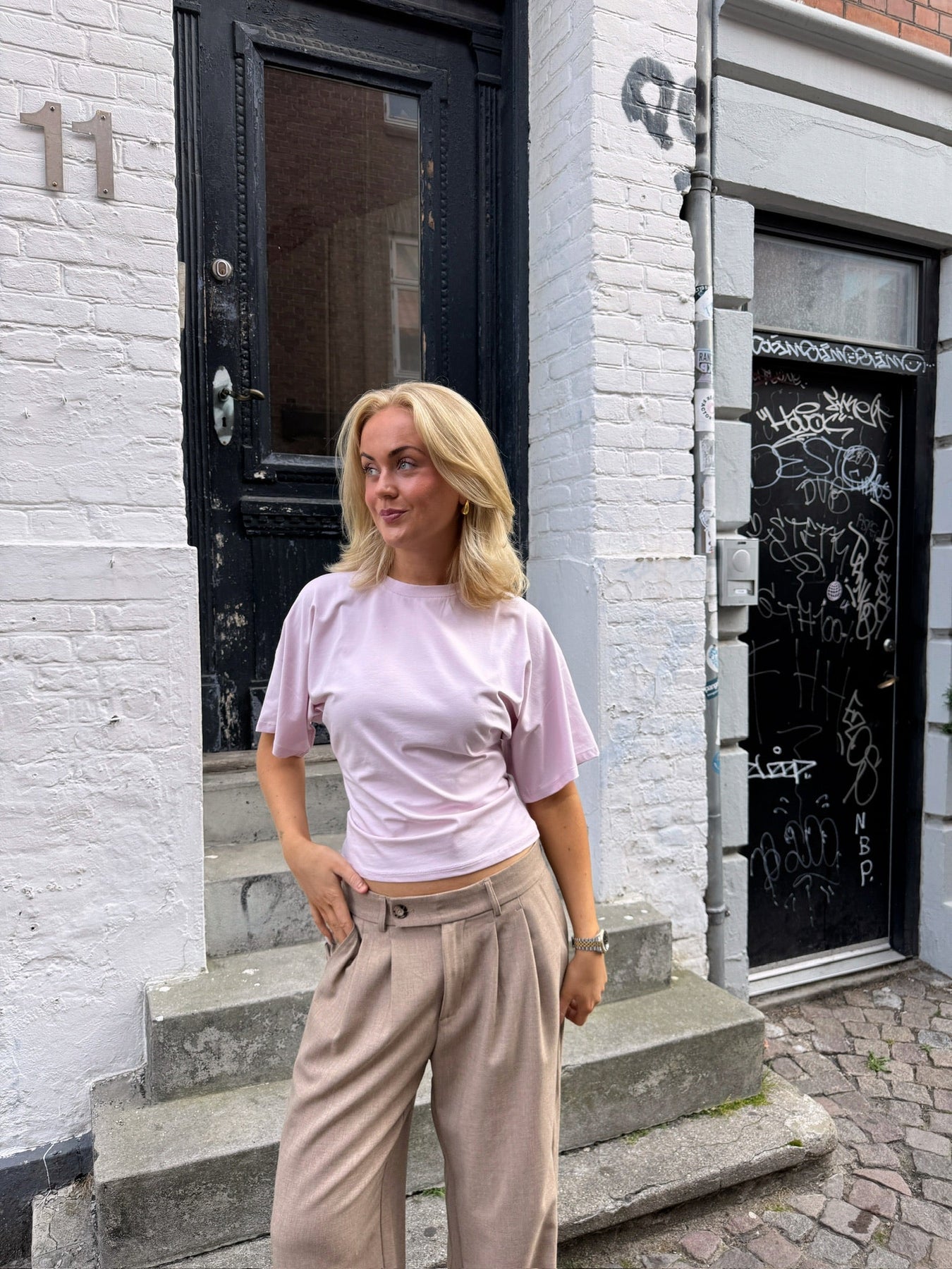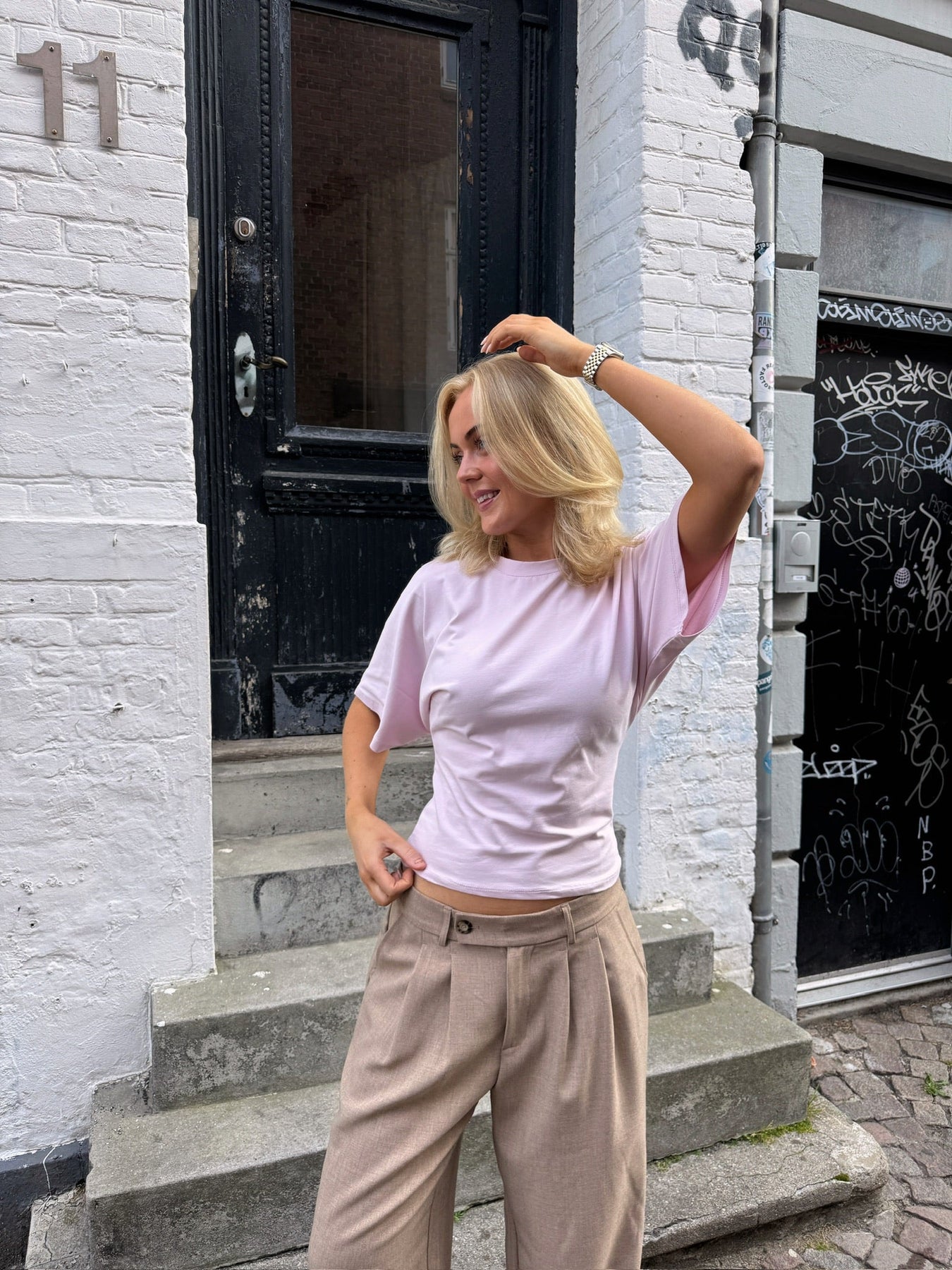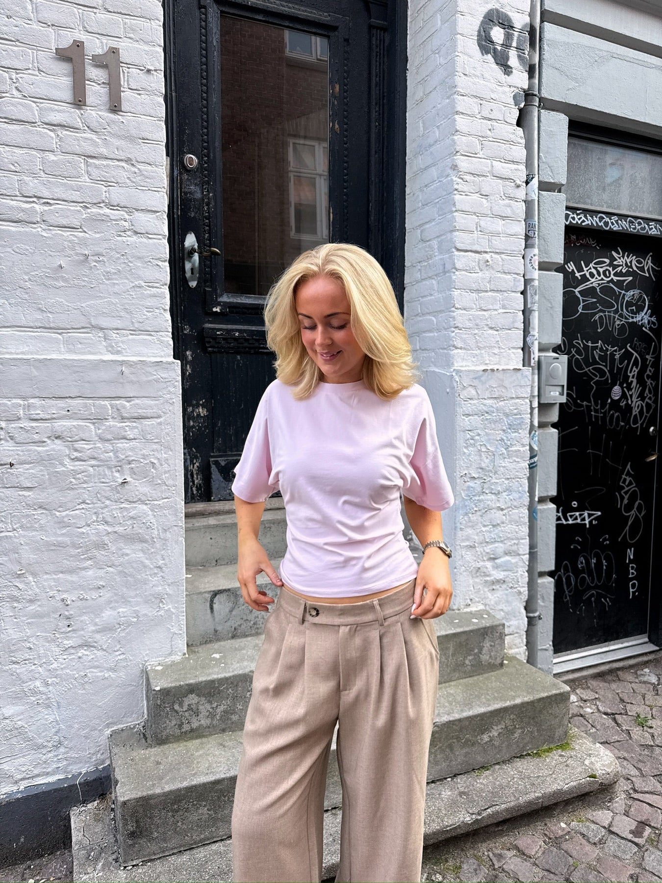 En top du bare altid kan bruge! Den har en superflatterende waisted pasform og korte ærmer, der gør den både enkel og feminin. Stoffet er blødt og strækbart, så den sidder pænt uden at stramme.