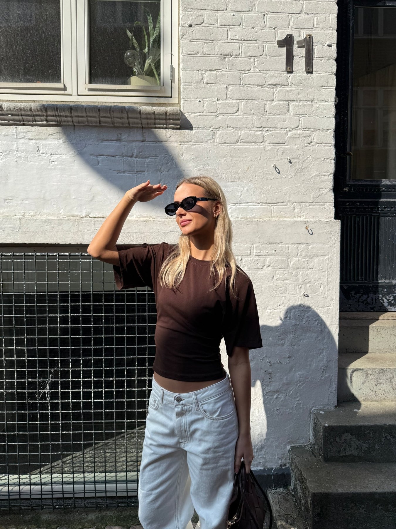 En top du bare altid kan bruge! Den har en superflatterende waisted pasform og korte ærmer, der gør den både enkel og feminin. Stoffet er blødt og strækbart, så den sidder pænt uden at stramme.