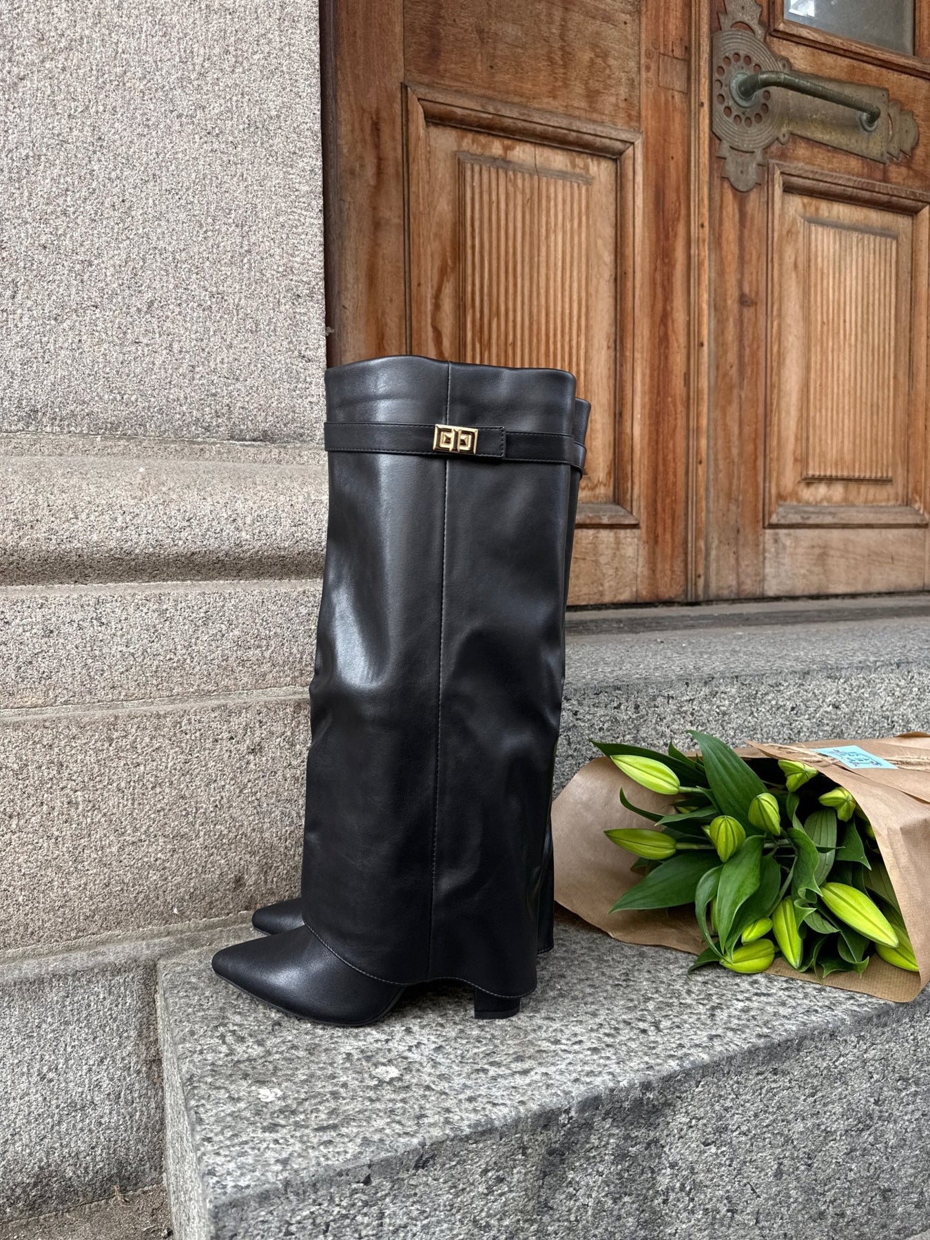 Disse sorte støvler kombinerer et klassisk look med moderne attitude. Det brede skaft giver et markant og stilrent udtryk, mens den spidse snude og den høje hæl tilfører skoen elegance og kant.