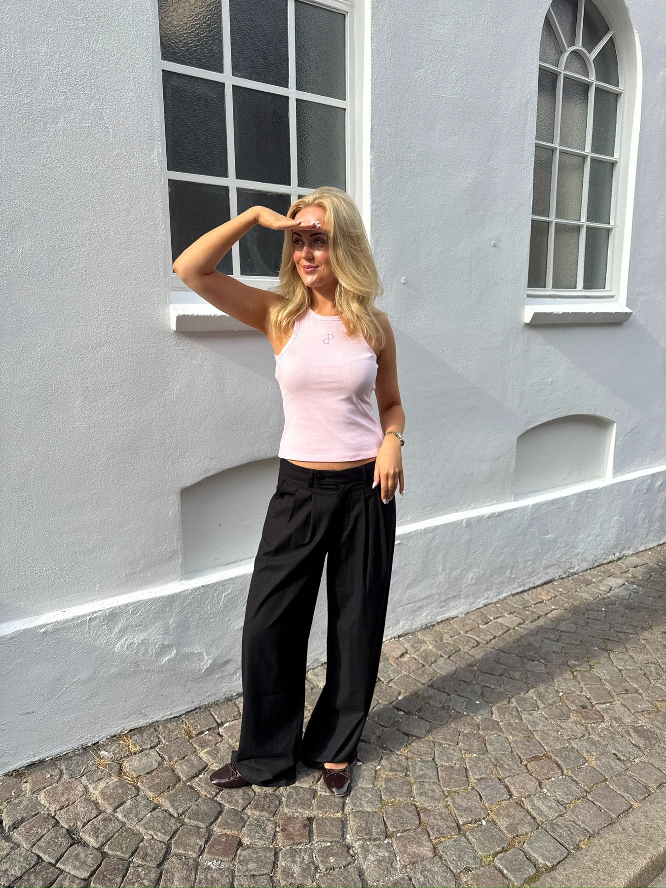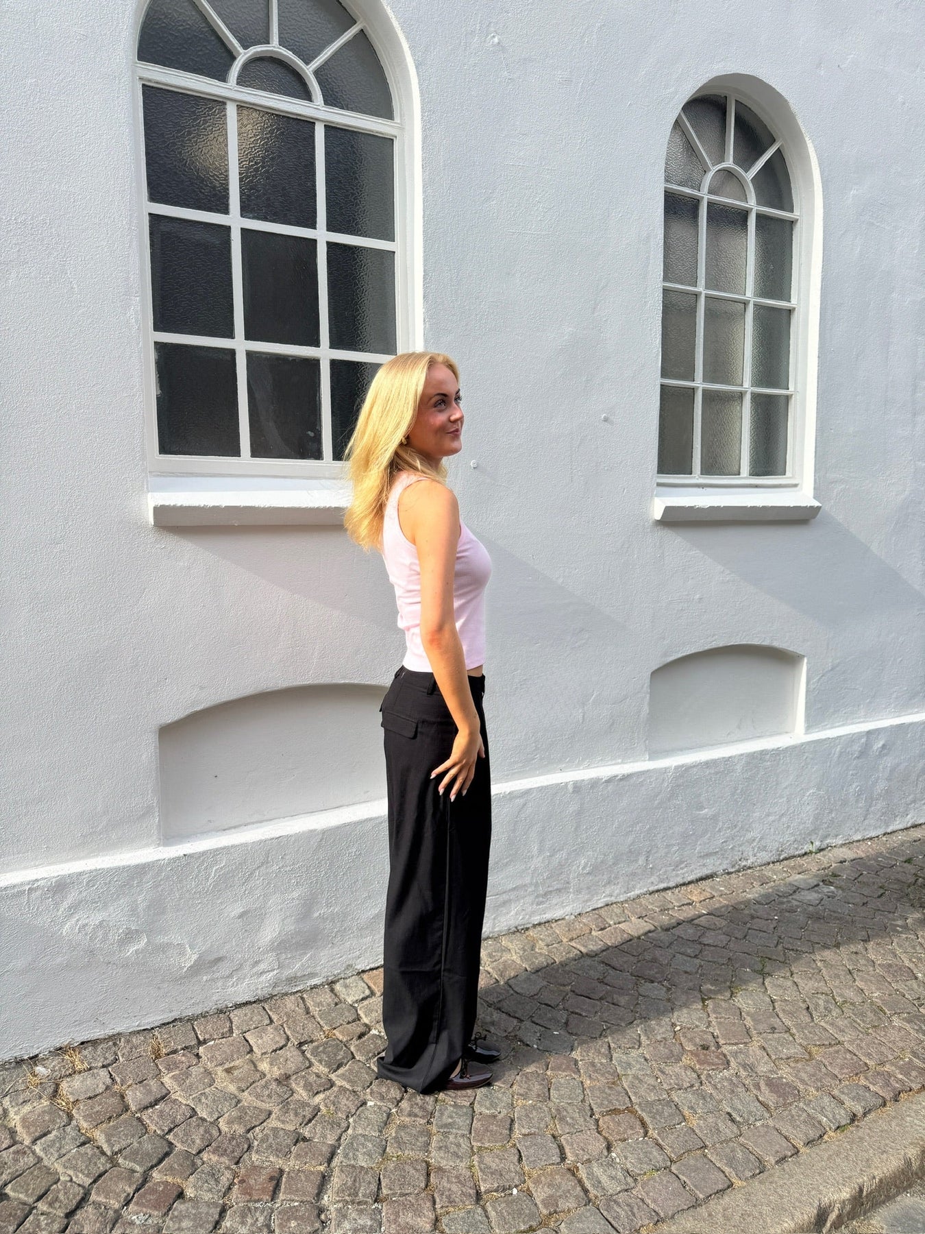 Et par elegante, løstsiddende bukser med brede ben og plisserede detaljer foran, der giver et sofistikeret, men afslappet udtryk. Bukserne har høj talje og sidelommer, hvilket gør dem både flatterende og praktiske i hverdagen.