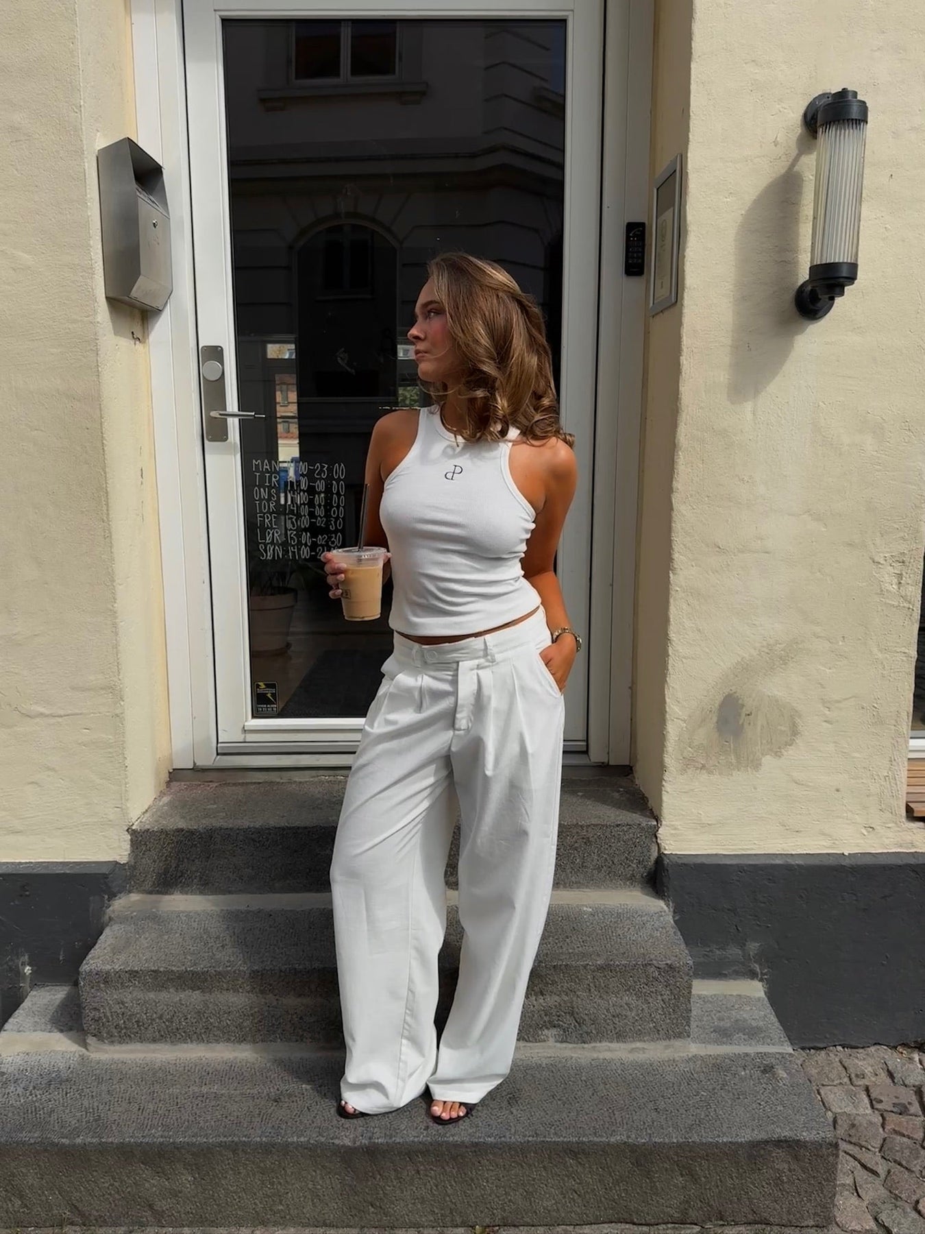 Et par elegante, løstsiddende bukser med brede ben og plisserede detaljer foran, der giver et sofistikeret, men afslappet udtryk. Bukserne har høj talje og sidelommer, hvilket gør dem både flatterende og praktiske i hverdagen.