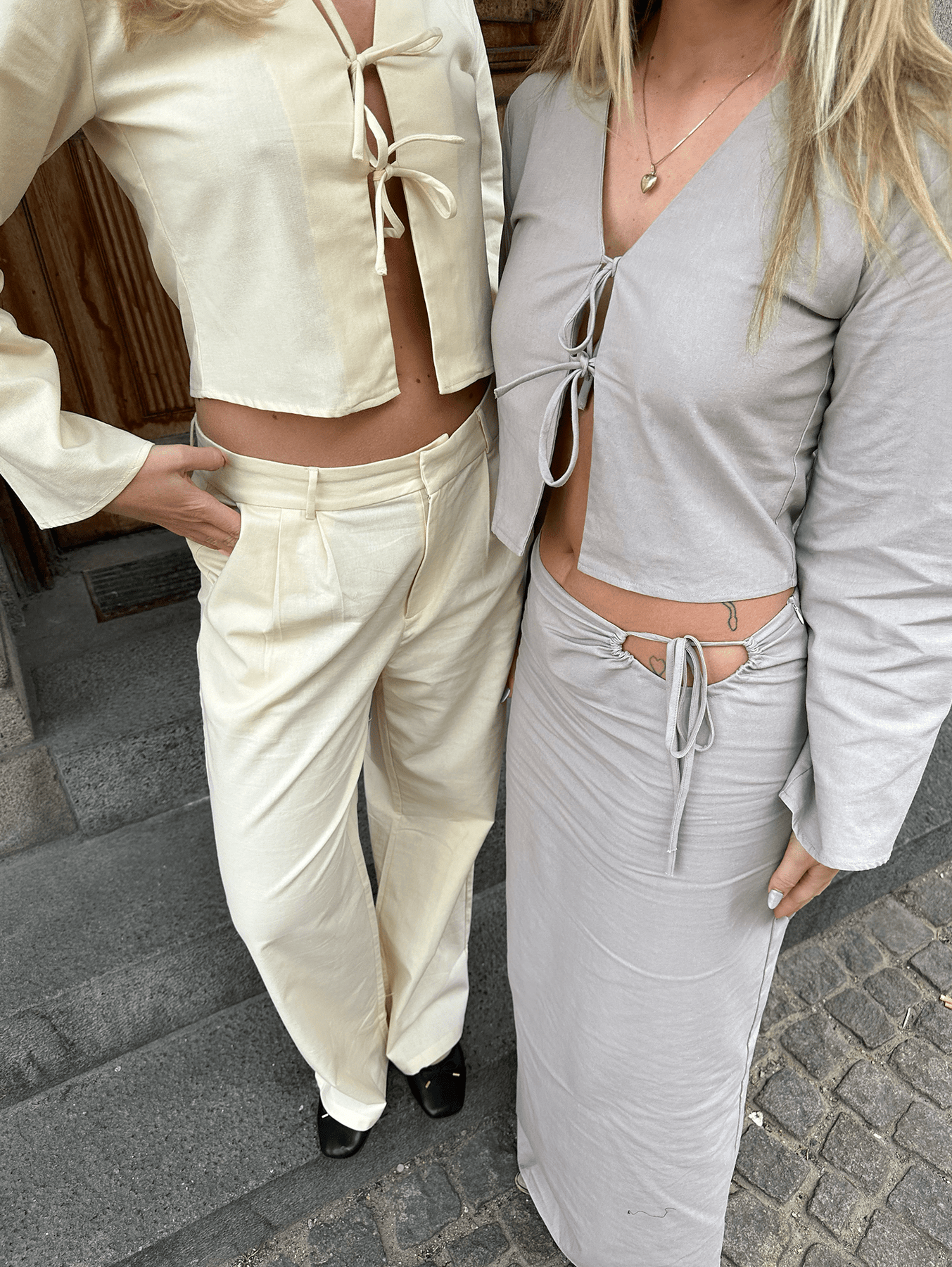 Fineste sæt med bindebånd langs fronten. Begge dele er lavet i en hørblanding, der sikrer at den ikke er gennemsigtig. Sættet er perfekt til de varmere aftener vi går i møde.