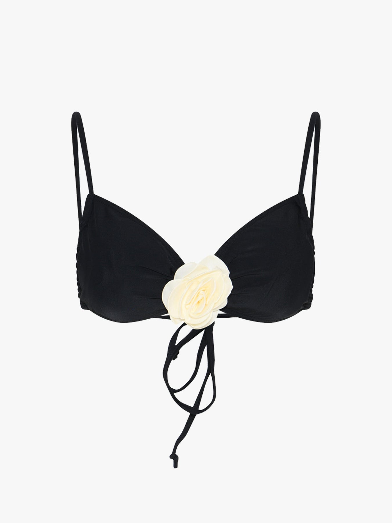 Liva Bikini har en bandeau overdel med en blomsterdetalje. Bikinien har tynde stropper og bindes på ryggen.