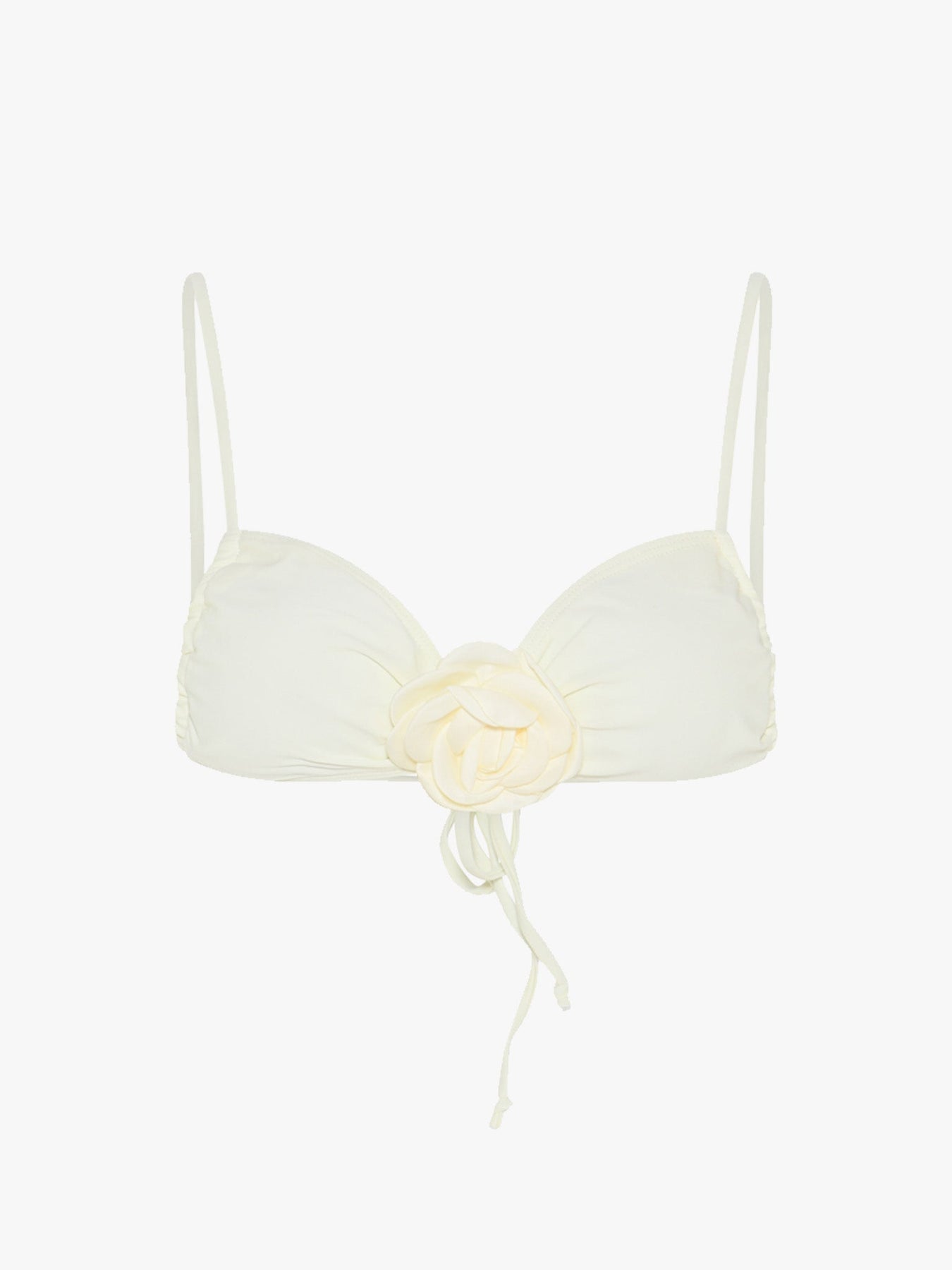 Liva Bikini har en bandeau overdel med en blomsterdetalje. Bikinien har tynde stropper og bindes på ryggen.