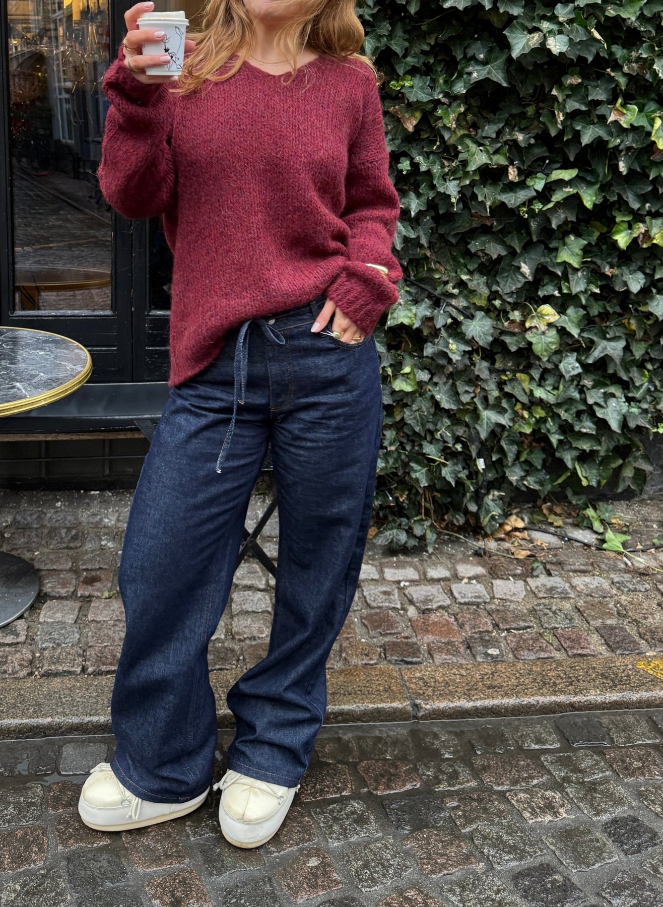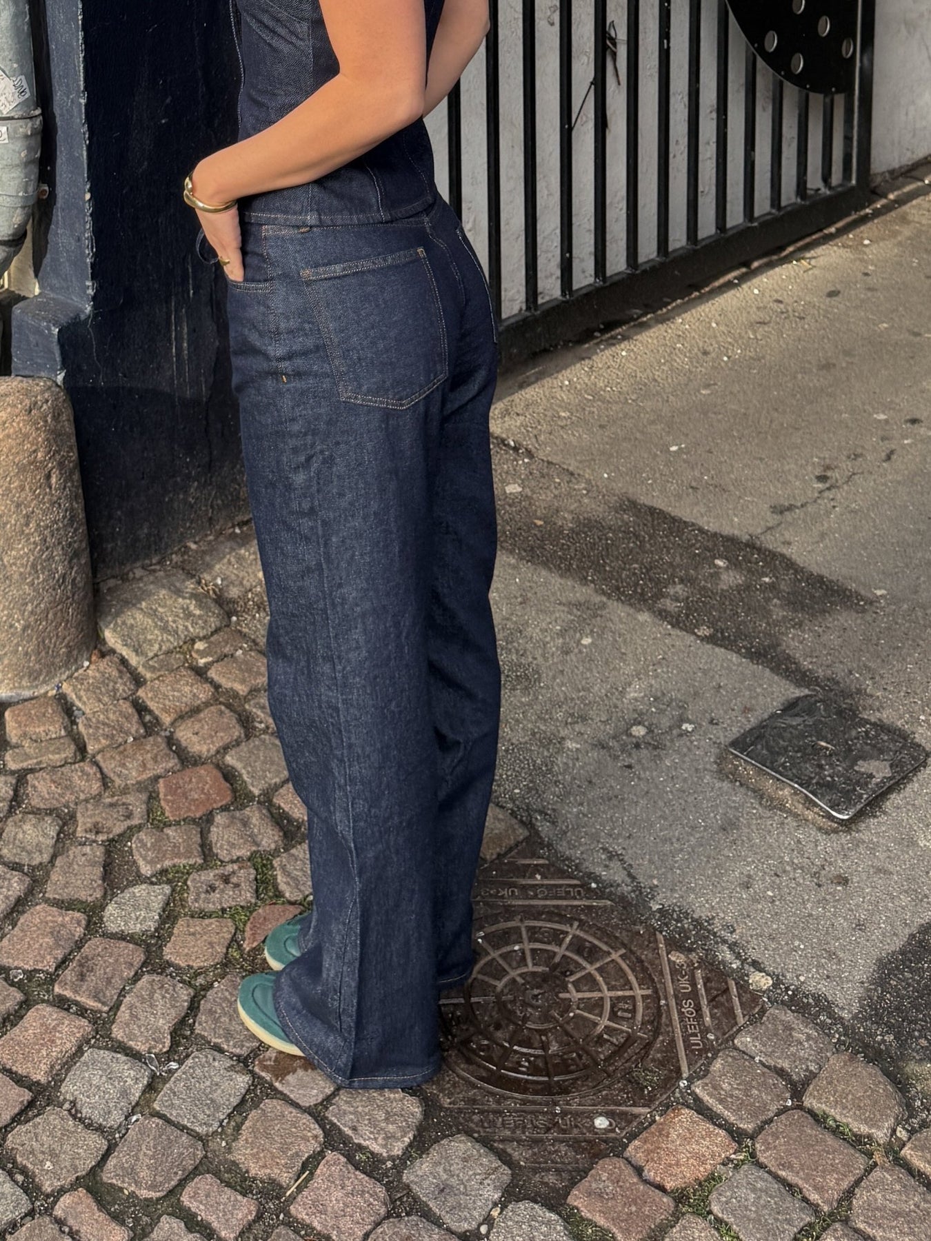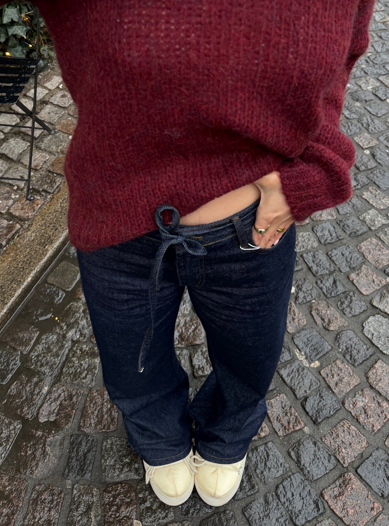 De mørkeblå belt jeans kombinerer klassisk denim med moderne kant. Det unikke bæltebånd i taljen giver et ekstra touch af stil og funktion, mens den brede pasform sikrer maksimal komfort hele dagen. Den dybe indigoblå vask tilfører et sofistikeret udtryk, der både fungerer til hverdagsbrug og mere edgy outfits. Perfekte med en matchende denimtop for et fuldt denim-on-denim look.