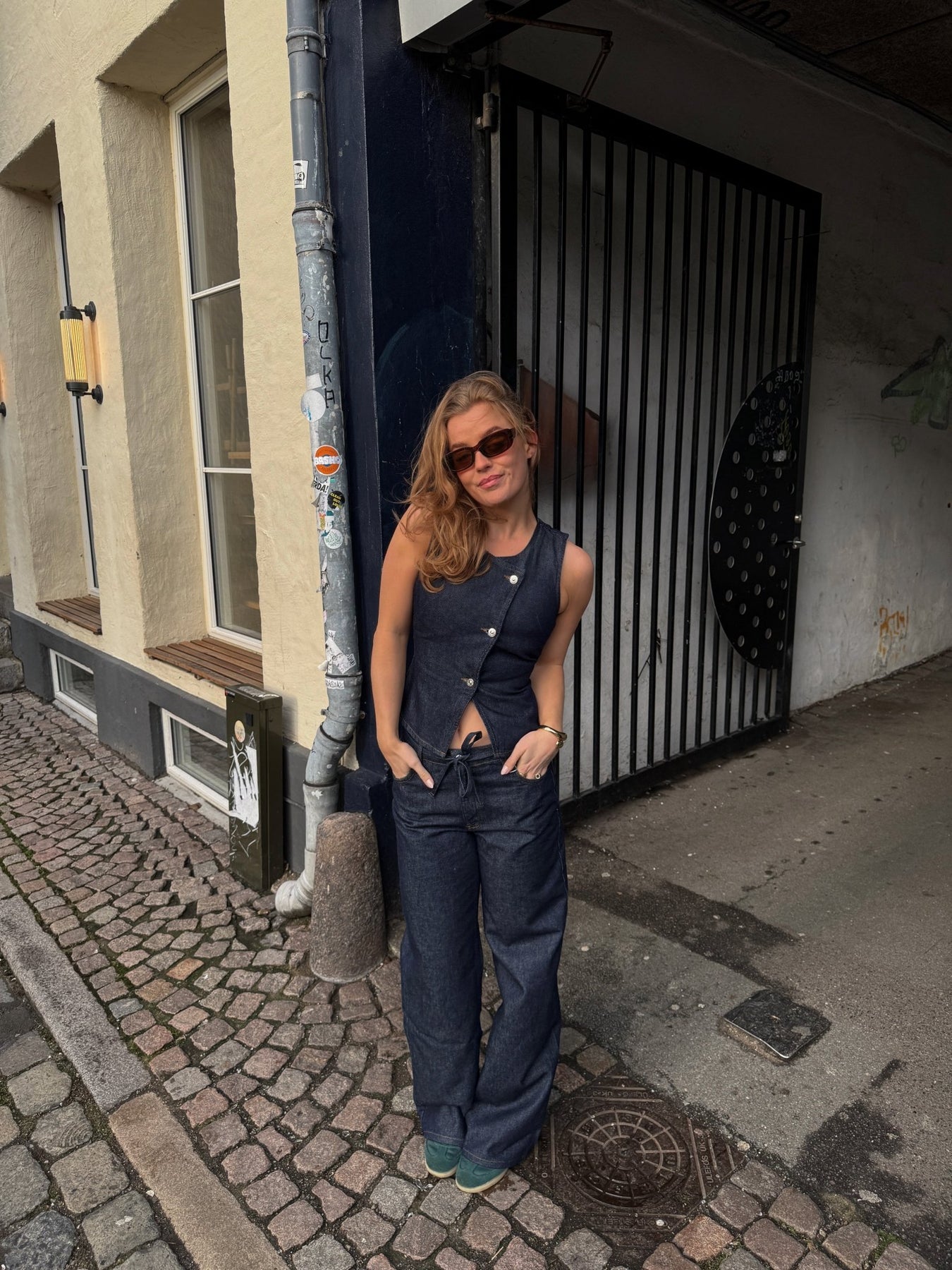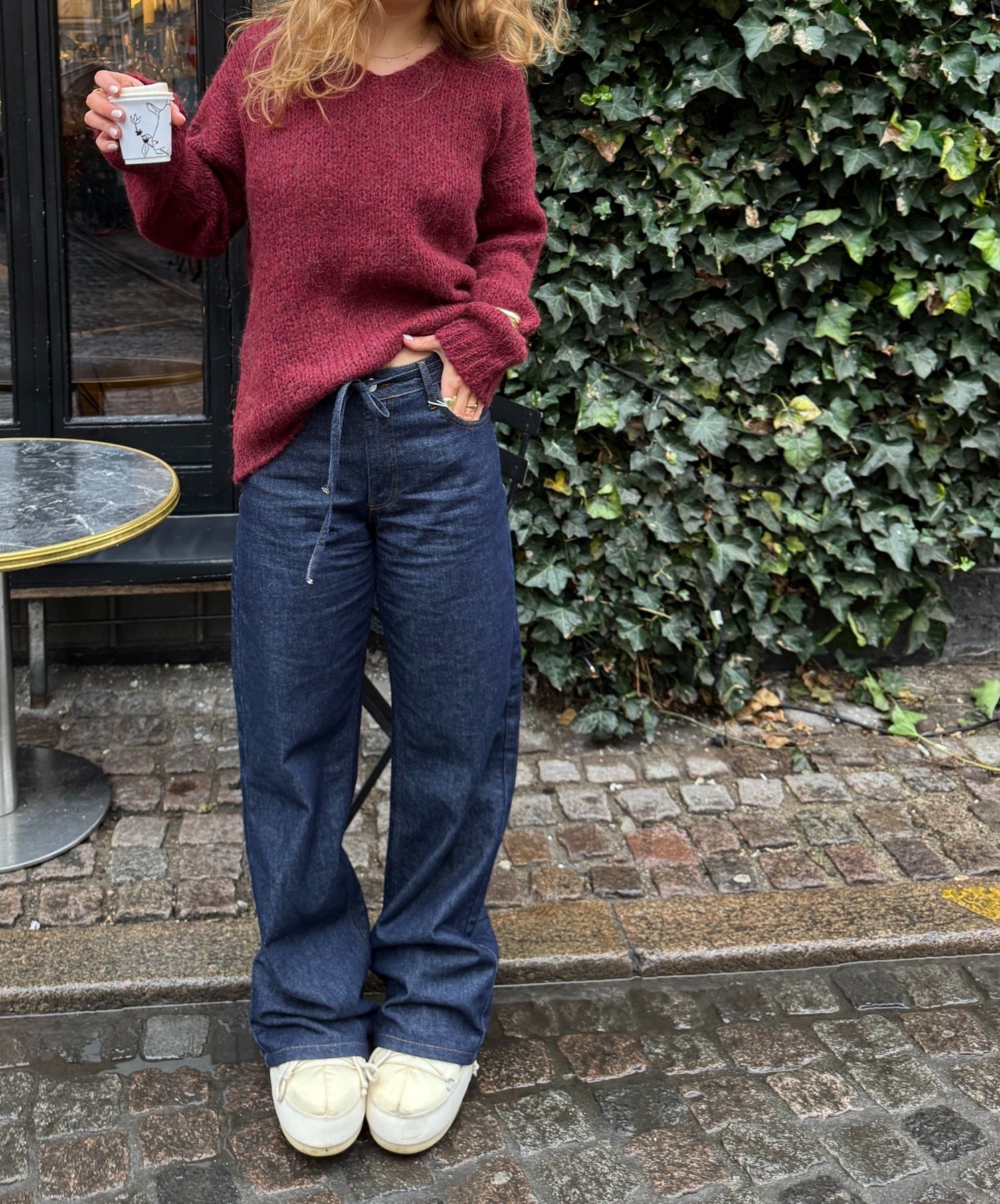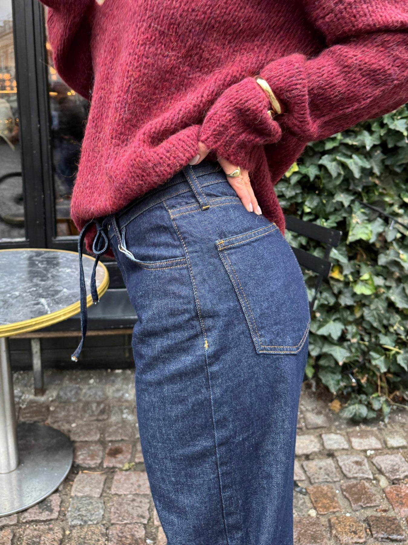 De mørkeblå belt jeans kombinerer klassisk denim med moderne kant. Det unikke bæltebånd i taljen giver et ekstra touch af stil og funktion, mens den brede pasform sikrer maksimal komfort hele dagen. Den dybe indigoblå vask tilfører et sofistikeret udtryk, der både fungerer til hverdagsbrug og mere edgy outfits. Perfekte med en matchende denimtop for et fuldt denim-on-denim look.